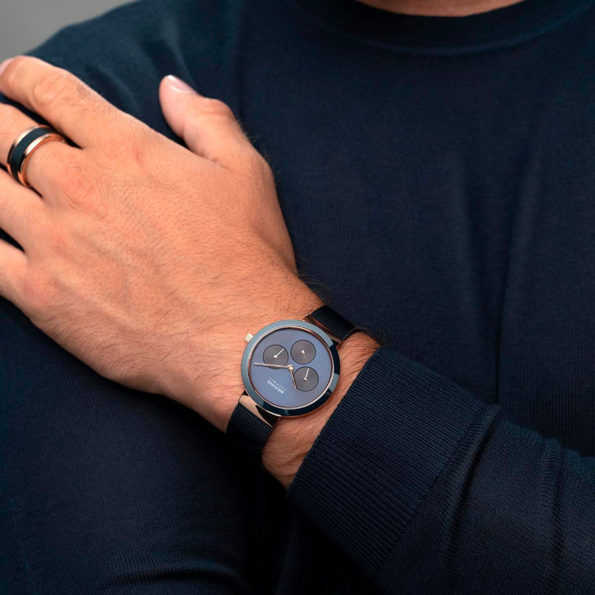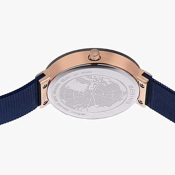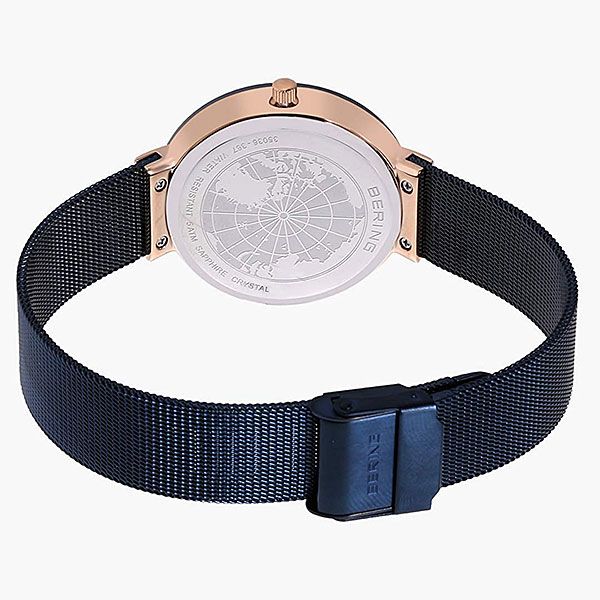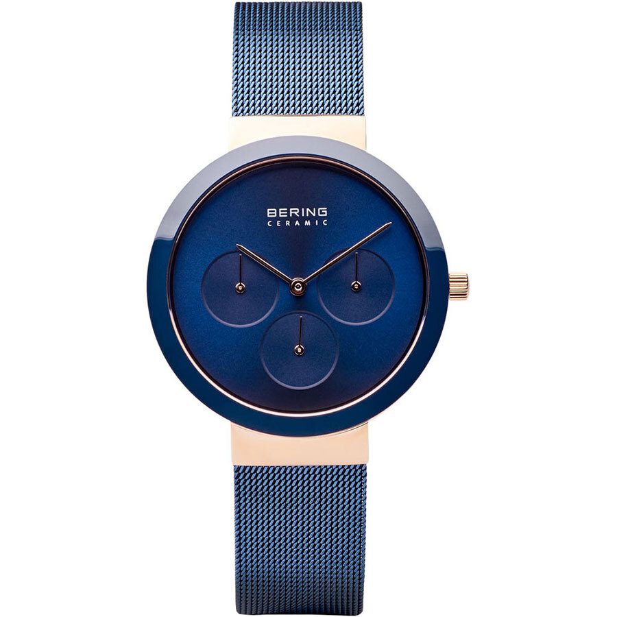 Кварцевые наручные часы с аналоговым отображением времени. Серия Ceramic. Унисекс часы. Центральные часовая и минутная стрелки золотистого цвета, секундная стрелка вынесена на дополнительный малый циферблат в позиции 6 часов. Синий циферблат без меток выполнен по технологии Sunray (солнечные лучи). Стрелочные указатели даты и дня недели вынесены на дополнительные малые циферблаты (даты в позиции 3 часов, дня недели в позиции 9 часов). Круглый стальной полированный корпус с IP покрытием цвета розового золота и синим керамическим безелем. Керамический безель с отделкой Smooth Touch. Диаметр корпуса 36 мм, толщина 8 мм. Устойчивое к возникновению мелких царапин плоское сапфировое стекло. Стальной браслет миланского плетения с синим IP покрытием. Ширина браслета 16 мм, длина браслета 185 мм. Регулируемая по длине застежка с предохранительной защелкой. Водонепроницаемость WR50 (мытьё рук, дождь).