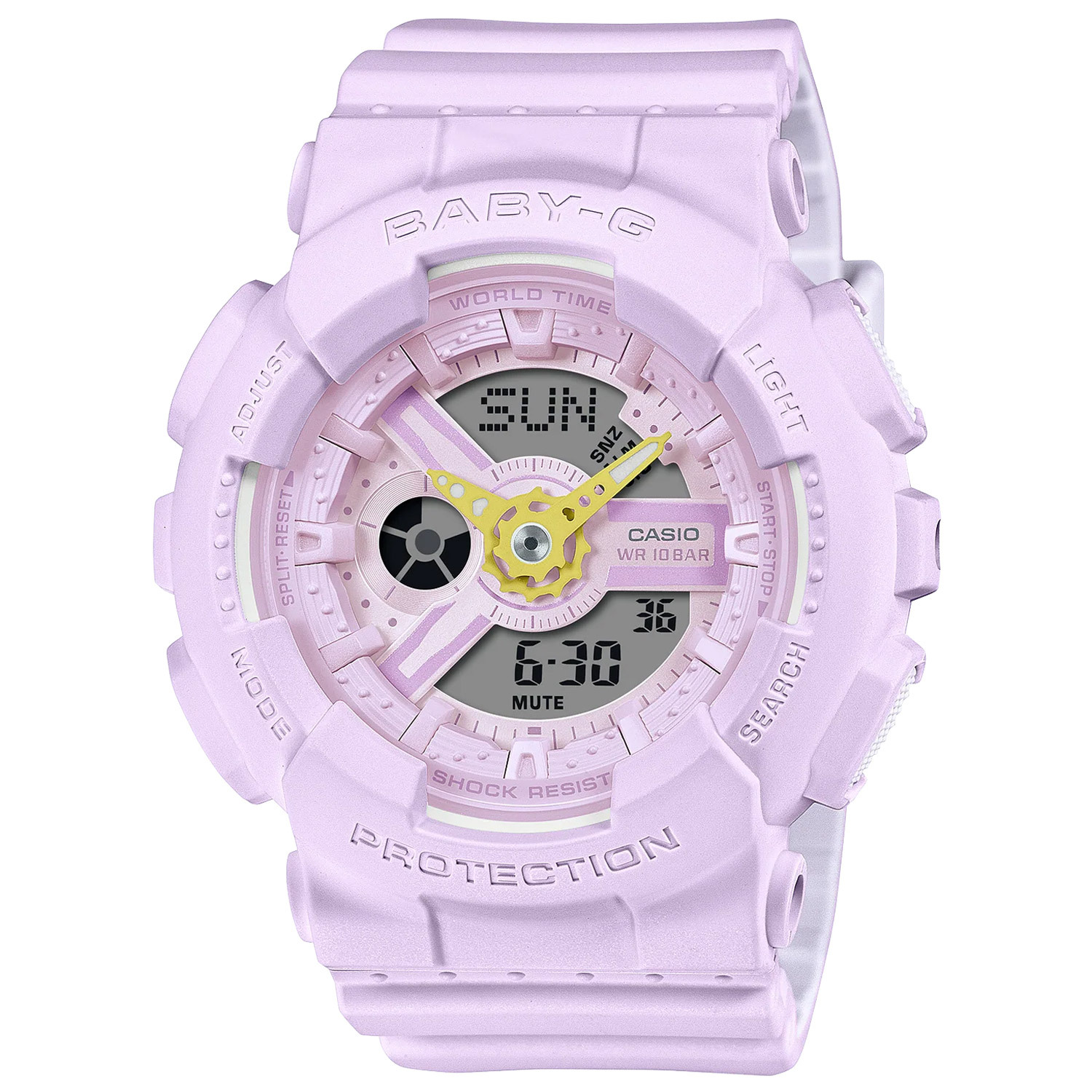 Женские кварцевые часы с аналого-цифровым отображением времени. Серия Casio Baby-G. Противоударный корпус защищает механизм часов от повреждений при ударах и вибрации. Циферблат подсвечивается светодиодом с функцией послесвечения. 12-ти и 24-х часовой формат отображения времени. Центральные часовая и минутная стрелки золотистого цвета. Стрелки с люминесцентным покрытием, которое светится в темноте после непродолжительного воздействия света. Секундомер с точностью показаний 1/100 секунды и временем измерения 24 часа. Режимы измерения: прошедшее время, промежуточное время, два финишных результата. Таймер обратного отсчета от 1 минуты до 24 часов (с интервалом 1 мин). Мировое время – 48 городов (29 часовых поясов), всемирное координированное время (UTC), включение/отключение летнего летнего времени (DST). Функция включения/отключения звука кнопок. 5 независимых будильников, один с функцией повтора сигнала Snooze,, сигнал начала часа. Автоматический календарь до 2099 года. Круглый корпус из полимерного пластика фиолетового цвета. Устойчивое к мелким механическим повреждениям минеральное стекло. Фиолетовый пластиковый ремешок с классической застёжкой buckle. Батарейка рассчитана на 2 года. Водонепроницаемость 100WR (часы подходят для плавания с маской и трубкой, обычного плавания). Вес около 45 г