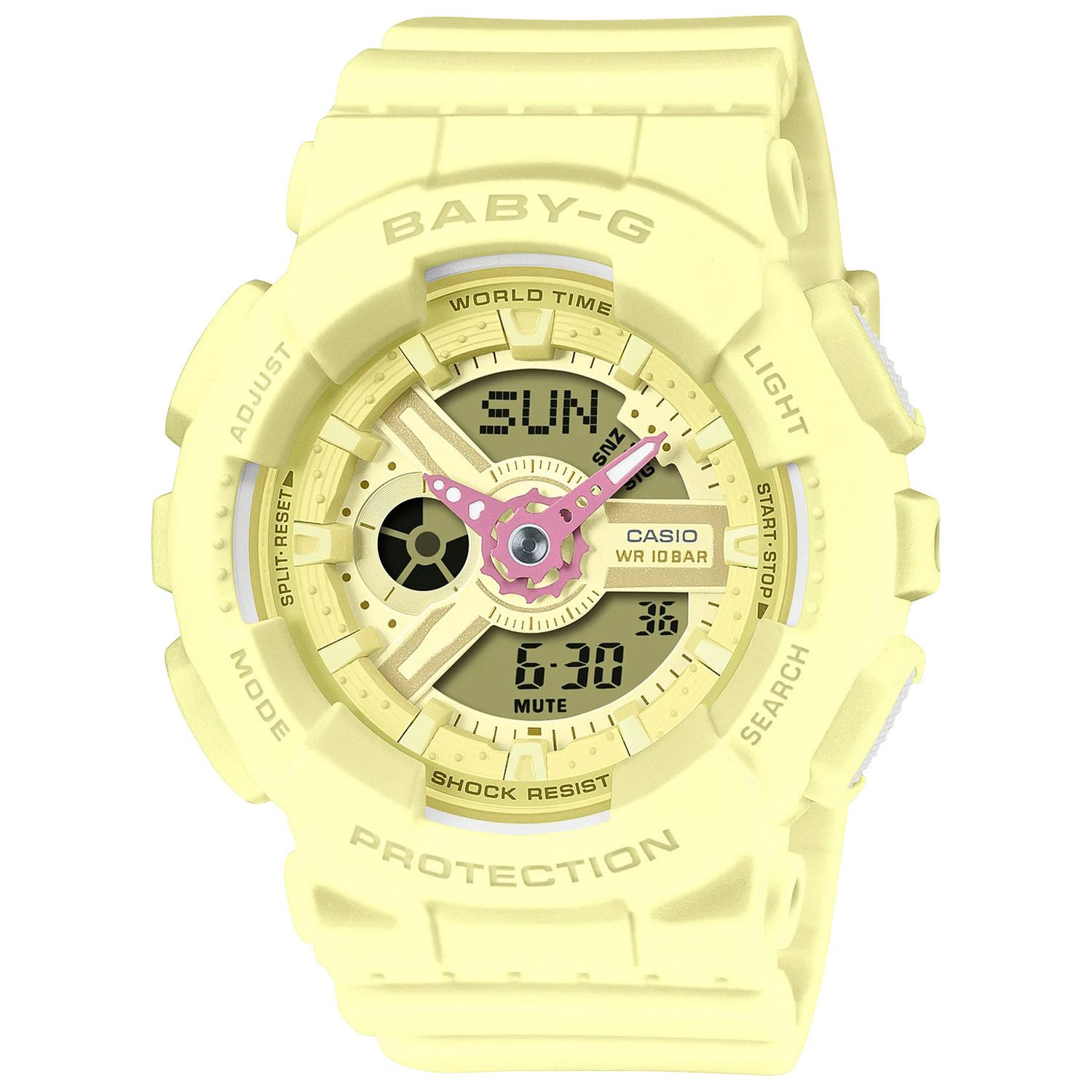 Женские кварцевые часы с аналого-цифровым отображением времени. Серия Casio Baby-G. Противоударный корпус защищает механизм часов от повреждений при ударах и вибрации. Циферблат подсвечивается светодиодом с функцией послесвечения. 12-ти и 24-х часовой формат отображения времени. Центральные часовая и минутная стрелки розового цвета. Стрелки с люминесцентным покрытием, которое светится в темноте после непродолжительного воздействия света. Секундомер с точностью показаний 1/100 секунды и временем измерения 24 часа. Режимы измерения: прошедшее время, промежуточное время, два финишных результата. Таймер обратного отсчета от 1 минуты до 24 часов (с интервалом 1 мин). Мировое время – 48 городов (29 часовых поясов), всемирное координированное время (UTC), включение/отключение летнего летнего времени (DST). Функция включения/отключения звука кнопок. 5 независимых будильников, один с функцией повтора сигнала Snooze,, сигнал начала часа. Автоматический календарь до 2099 года. Круглый корпус из полимерного пластика жёлтого цвета. Устойчивое к мелким механическим повреждениям минеральное стекло. Жёлтый пластиковый ремешок с классической застёжкой buckle. Батарейка рассчитана на 2 года. Водонепроницаемость 100WR (часы подходят для плавания с маской и трубкой, обычного плавания). Вес около 45 г