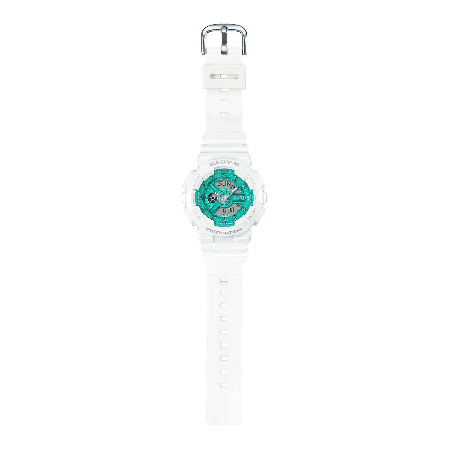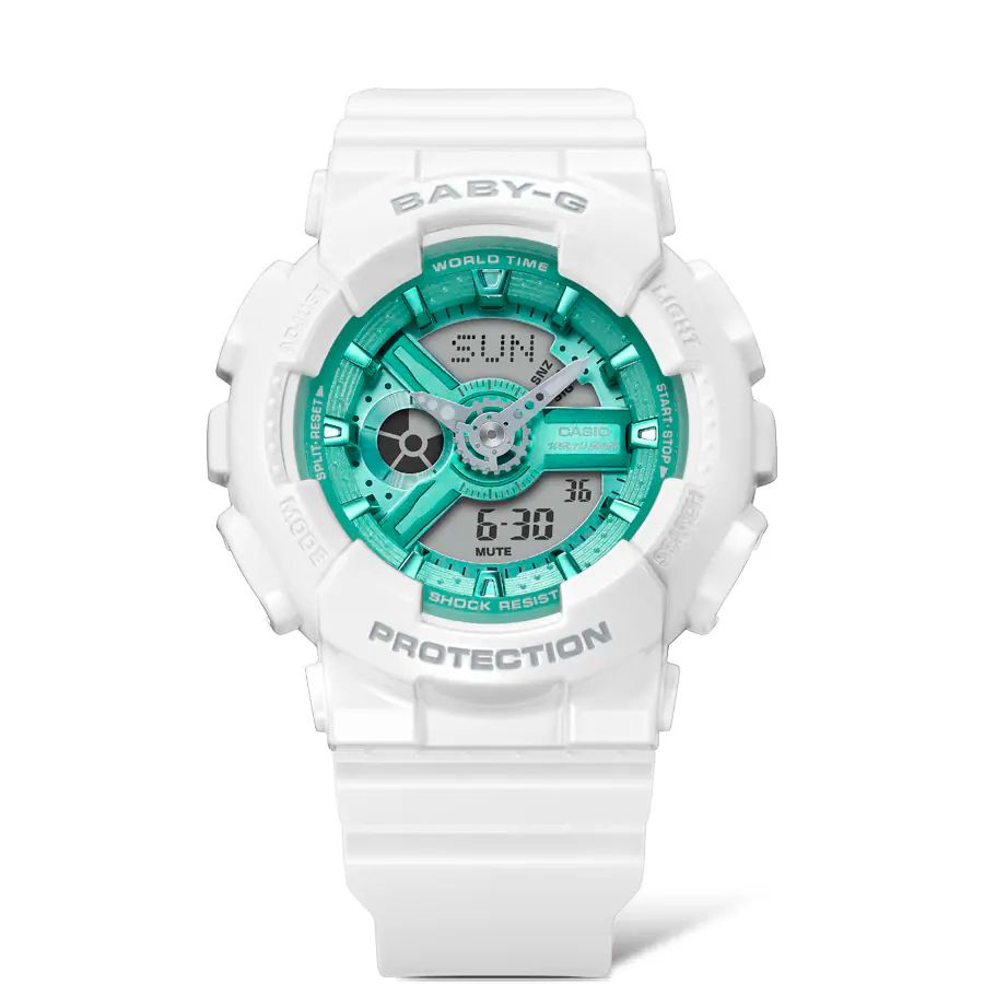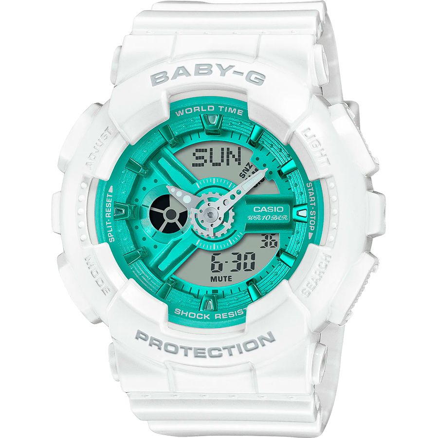 Женские кварцевые наручные аналогово-цифровые спортивные часы. Коллекция Casio Baby-G. Противоударный корпус защищает механизм часов от ударов и вибрации. Циферблат подсвечивается светодиодом. В часах есть функция послесвечения - подсветка продолжает работать несколько секунд после того как кнопка подсветки была отпущена. 12-ти и 24-х часовой формат отображения времени. Центральные часовая и минутная стрелки. Секундомер с точностью показаний 1/100 с и временем измерения 24 часа. Режимы измерения: прошедшее время, промежуточное время, два финиша. Таймер обратного отсчета от 1 мин до 24 часов (с интервалом 1 мин). Мировое время – 48 городов (29 часовых поясов). Функция включения/отключения летнего времени. Функция включения/отключения звука кнопок. 5 независимых будильников, один с функцией Snooze (повтор сигнала) , ежечасный сигнал. Автоматический календарь до 2099 года. Круглый корпус из полимерного пластика. Устойчивое к мелким механическим повреждениям минеральное стекло. Пластиковый ремешок. Водонепроницаемость 100 WR (плавание с маской и трубкой). Вес около 45 г
