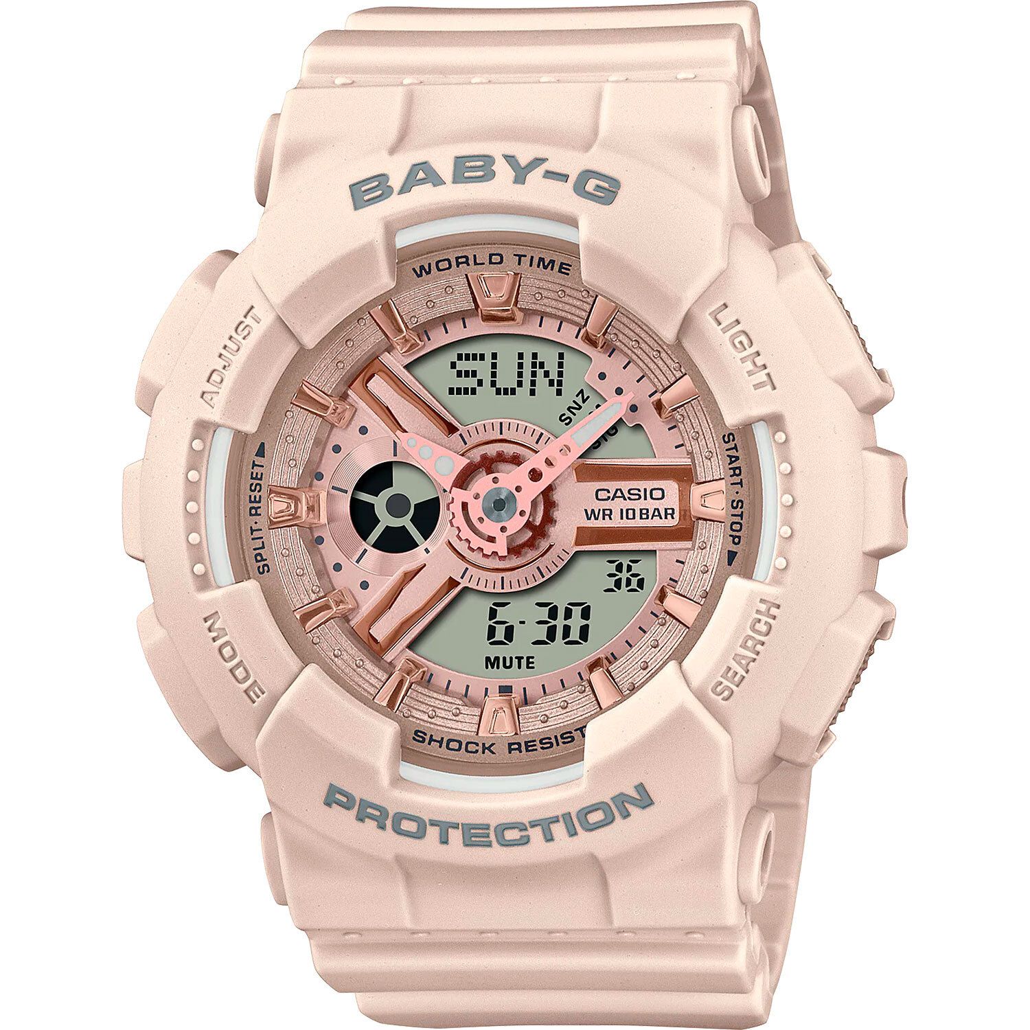 Женские кварцевые часы. Подсветка. Центральные часовая и минутная стрелки. Функция мирового времени - 29 часовых зон (48 городов). Секундомер с точностью 1/100 секунды и пределом измерения 24 часа. Таймер. 5 ежедневных будильника, один из них с функцией повтора будильника. Автоматический календарь. Ежечасный сигнал. 12/24х часовой формат времени. Включение/выключение звука кнопок. Розовый циферблат. Ударопрочный круглый корпус выполнен из полимерного пластика розового цвета. Размеры корпуса составляет 46,3 х 43,4 х 15,8 мм. Розовый ремешок выполнен из полимерного материала, стандартная застежка. Прочное минеральное стекло устойчивое к мелким механическим повреждениям. Водостойкость WR 100 (плавание без погружения). Вес примерно 45 гр.