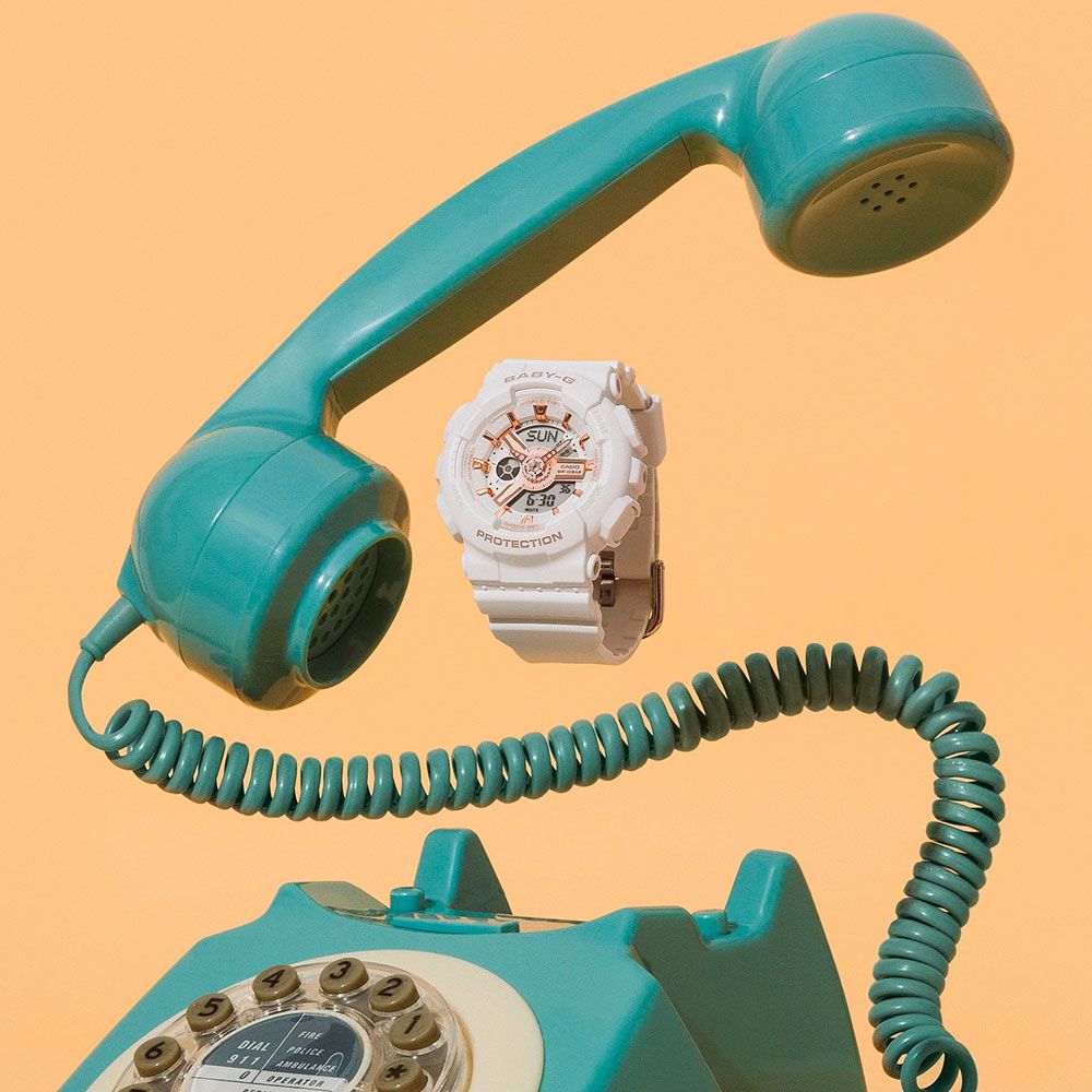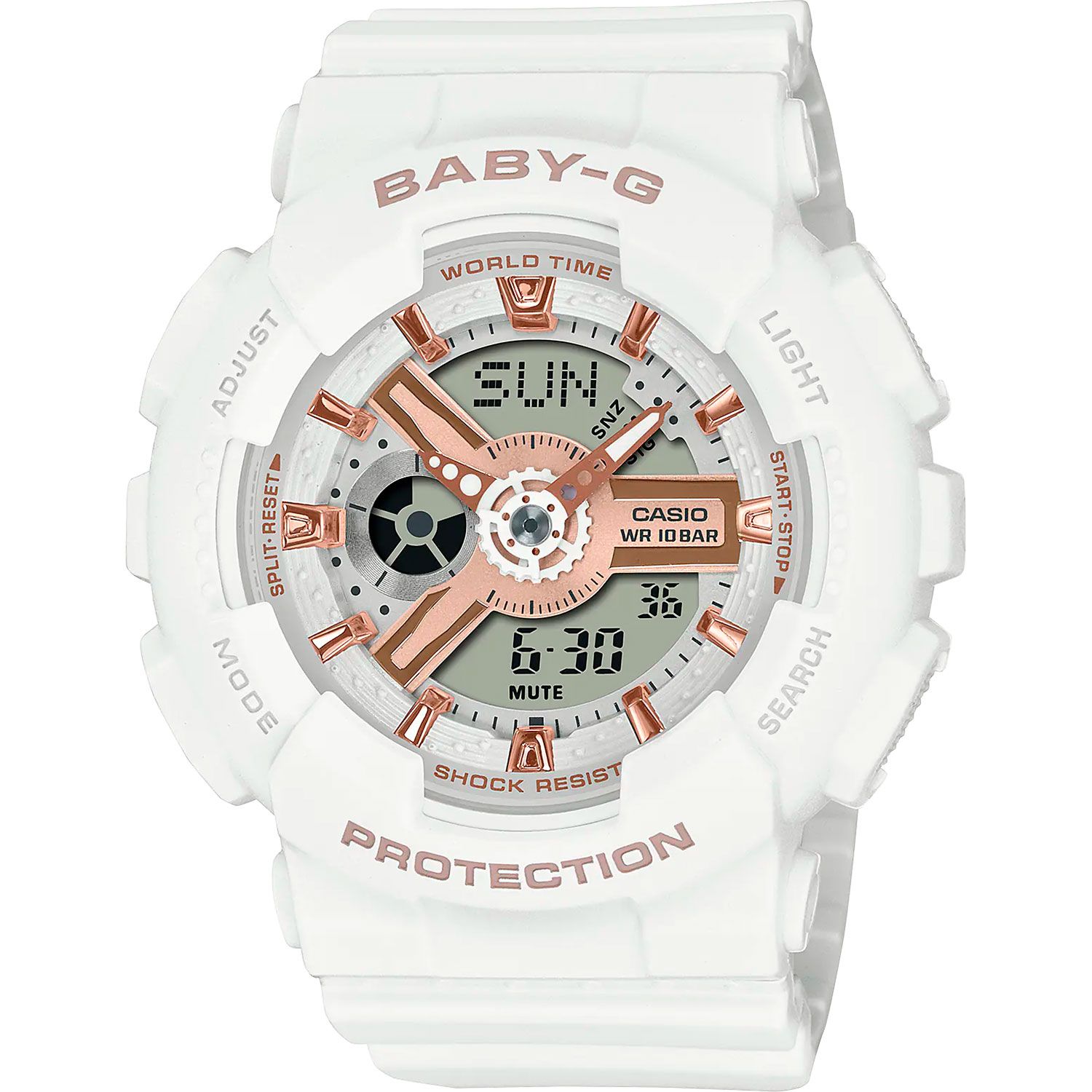 Женские кварцевые часы. Подсветка. Центральные часовая и минутная стрелки. Функция мирового времени - 29 часовых зон (48 городов). Секундомер с точностью 1/100 секунды и пределом измерения 24 часа. Таймер. 5 ежедневных будильника, один из них с функцией повтора будильника. Автоматический календарь. Ежечасный сигнал. 12/24х часовой формат времени. Включение/выключение звука кнопок. Белый циферблат с золотисто-розовыми элементами. Ударопрочный круглый корпус выполнен из полимерного пластика белого цвета. Размеры корпуса составляет 46,3 х 43,4 х 15,8 мм. Белый ремешок выполнен из полимерного материала, стандартная застежка. Прочное минеральное стекло устойчивое к мелким механическим повреждениям. Водостойкость WR 100 (плавание без погружения). Вес примерно 45