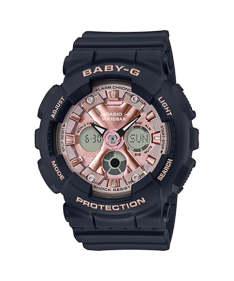 Женские кварцевые аналого-цифровые часы. Коллекция Casio Baby-G. Противоударный корпус защищает механизм часов от ударов и вибрации. Двойная светодиодная подсветка с функцией послесвечения. Необритовое светонакопительное покрытие стрелок обеспечивает длительное послесвечение в темноте после непродолжительного воздействия света. 12-ти и 24-х часовой формат отображения времени. Секундомер с точностью показаний 1/100 секунды и временем измерения 24 часа. Режимы измерения: прошедшее время, промежуточное время, два финишных результата. Таймер обратного отсчета от 1 мин до 24 ч. Мировое время: 48 городов (29 часовых поясов), функция включения/отключения летнего времени (DST). Функция включения/отключения звука кнопок. 5 независимых будильников, один с функцией повтора сигнала Snooze, ежечасный сигнал. Автоматический календарь до 2099 года. Круглый пластиковый корпус чёрного цвета диаметром 43,3 мм, толщиной 46,3 мм. Устойчивое к мелким механическим повреждениям минеральное стекло. Чёрный пластиковый ремешок с надписью с классической застёжкой buckle. Батарейка рассчитана на 2 года. Водонепроницаемость 100 WR (плавание с маской и трубкой). Вес около 45 г