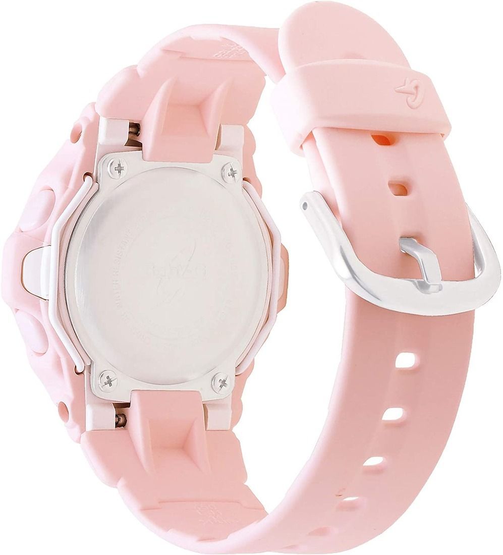 Женские кварцевые электронные наручные часы. Коллекция Casio Baby-G. Противоударный корпус защищает механизм часов от ударов и вибрации. Электролюминесцентная подсветка с функцией послесвечения. Записная телефонная книжка для хранения фамилий и номеров телефонов на 25 абонентов. Счетчик дней - отображает число дней между текущей и какой-либо другой датой. Емкость памяти: 5 записей (8 символов). Мировое время 29 часовых зон (30 городов), отображение кода города. Автоматический переход на зимнее и летнее время, возможность включения/отключения данной функции. Секундомер с точностью показаний 1/100 с и временем измерения 1 час. Таймер обратного отсчета от 1 минуты до 24 часов. 5 ежедневных будильников, один с функцией повтора сигнала Snooze, ежечасный сигнал. Функция включения/отключения звука кнопок. Автоматический календарь до 2099 года. 12/24х часовой формат отображения времени. Устойчивое к мелким механическим повреждениям минеральное стекло. Круглый пластиковый корпус розового цвета. Стальной безель. Размеры корпуса 42,6 мм на 45,9 мм, толщина 16,4 мм. Протекторы дисплея. Розовый пластиковый ремешок с классической застежкой buckle. Батарея рассчитана на 3 года. Водозащита 200 WR (плавание с маской и трубкой). Вес около 43 г.
