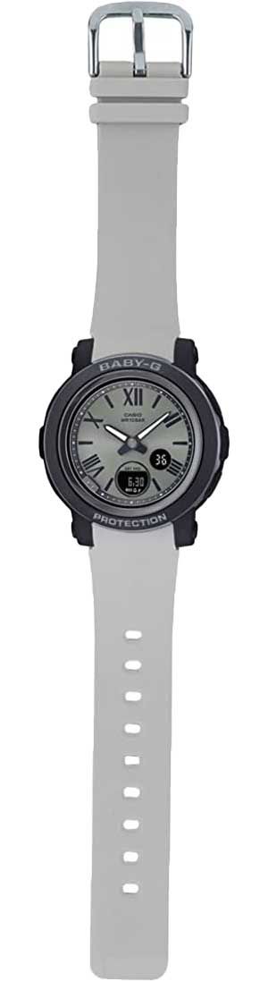 Женские кварцевые наручные часы. Серия Baby-G. Противоударный корпус защищает механизм от ударов и вибрации. Аналогово - цифровой циферблат. Двойная подcветка: циферблат и ЖК-дисплеи подсвечиваются светодиодом, благодаря наличию функции задержки, после отпускания кнопки освещение горит еще несколько секунд. Настраиваемое послесвечение 1,5 или 3с. Необритовое светонакопительное покрытие обеспечивает длительное послесвечение в темноте даже после кратковременного нахождения на свету. 12-ти и 24-х часовой формат времени. Секундомер с двумя точностями показаний: 1/100с (до 1ч) и 1с (после 1ч) и временем измерения 24ч. Таймер обратного отсчета от 1мин до 24ч. Мировое время – 48 городов (31 часовой пояс), всемирное координированное время (UTC). Автоматический переход на зимнее и летнее время, возможность включения/отключения данной функции. Функцияиперемещения стрелок и включения/отключения звука. Круглый корпус выполнен из полимерного пластика. Задняя крышка из нержавеющей стали с креплением к корпусу на винтах. Пластиковый ремешок с классической застежкой.