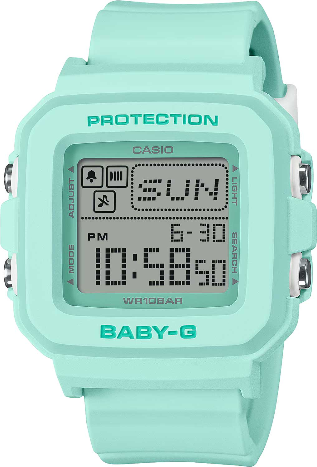 Женские кварцевые электронные часы. Коллекция Baby-G. Противоударный корпус защищает механизм часов от ударов и вибрации. Светодиодная подсветка с функцией послесвечения. Продолжительность свечения 2 секунды. При нажатии кнопки подсветки в режиме текущего времени, на ЖК-дисплее в случайном порядке появляется серия пиксельных анимаций (серфер, танцор, дельфин, иглобрюхая рыба, собака, кошка). Секундомер с точностью показаний 1/100 с и временем измерения 24 часа. Режимы измерения: прошедшее время, промежуточное время, два финишных результата. Таймер обратного отсчета от 1 минуты до 24 часов с автоповтором. 12-ти и 24-х часовой формат отображения времени. 5 ежедневных будильников, почасовой сигнал времени. Мировое время: 29 часовых поясов (30 городов), включение/отключение летнего времени. Автоматический календарь до 2099 г. Включение/выключение звука кнопок. Прямоугольный корпус из полимерного пластика зелёного цвета. Размер корпуса 39 мм на 42,8 мм , толщина 14,7 мм. Зелёный пластиковый ремешок со стандартной застежкой. Минеральное стекло устойчивое к мелким механическим повреждениям. Водостойкость WR 100 (плавание и ныряние без акваланга). Вес примерно 33 г.