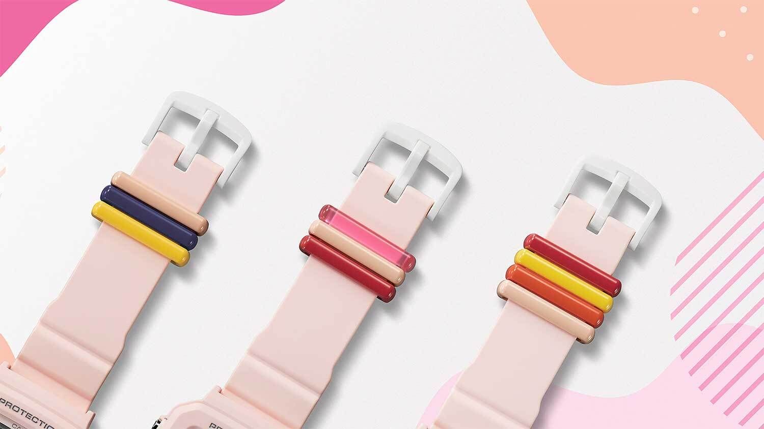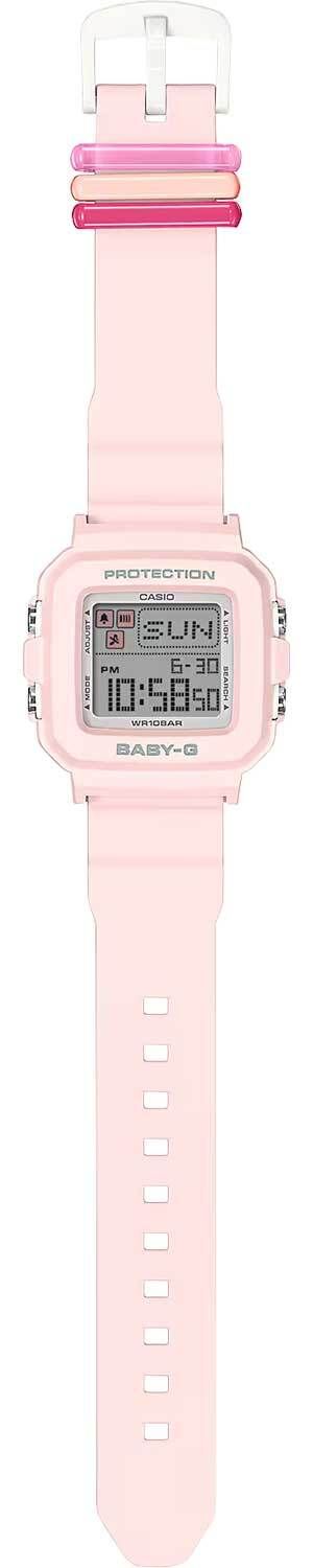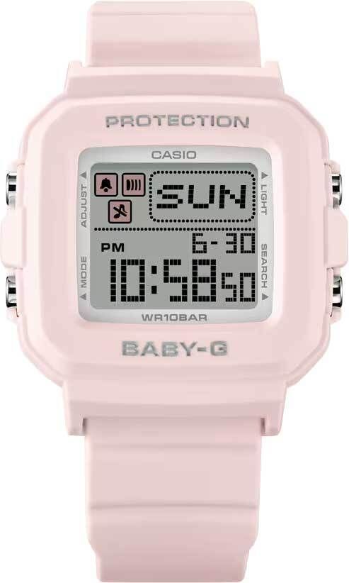 Женские кварцевые электронные часы. Коллекция Baby-G+. Противоударный корпус защищает механизм часов от ударов и вибрации. Светодиодная подсветка с функцией послесвечения. Продолжительность свечения 2 секунды. При нажатии кнопки подсветки в режиме текущего времени, на ЖК-дисплее в случайном порядке появляется серия пиксельных анимаций (серфер, танцор, дельфин, иглобрюхая рыба, собака, кошка). Секундомер с точностью показаний 1/100 с и временем измерения 24 часа. Режимы измерения: прошедшее время, промежуточное время, два финишных результата. Таймер обратного отсчета от 1 с до 24 часов с автоповтором. 12-ти и 24-х часовой формат отображения времени. 5 ежедневных будильников, почасовой сигнал времени. Мировое время: 29 часовых поясов (30 городов), включение/отключение летнего времени. Автоматический календарь до 2099 г. Включение/выключение звука кнопок. Прямоугольный корпус из полимерного пластика розового цвета. Размер корпуса 39 мм на 42,8 мм , толщина 14,7 мм. Розовый пластиковый сплошной ремешок с классической застежкой. Минеральное стекло устойчивое к мелким механическим повреждениям. В комплекте сменные разноцветные петли для ремешка. Водостойкость WR 100 (плавание и ныряние без акваланга). Вес примерно 34 г.