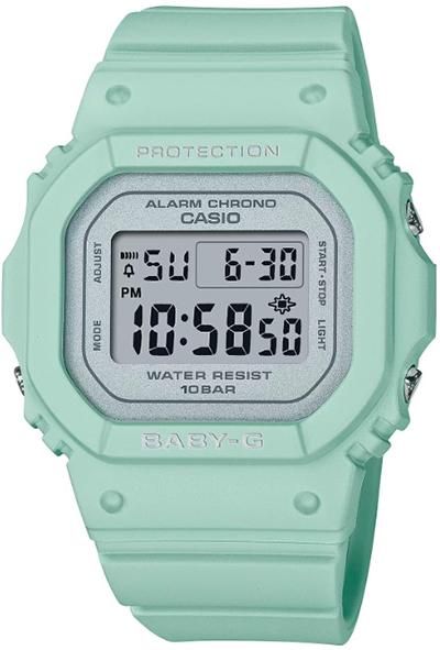 Женские кварцевые наручные часы. Серия Casio Baby-G. Цифровое отображением времени. Противоударный корпус защищает механизм часов от ударов и вибрации. Электролюминесцентная подсветка освещает весь циферблат, после отпускания кнопки свечение продолжается еще некоторое время. LED-индикатор - светодиодная лампочка начинает мигать сразу же при будильнике, окончании таймера обратного отсчета или секундомера. 12-ти и 24-х часовой формат времени. Секундомер с двумя точностями показаний: 1/100 с (до 1 ч) и 1 с (после 1 часа) и временем измерения 24 часа. Таймер обратного отсчета от 1 с до 24 часов с автоповтором. Типы сигналов: ежедневный, ежемесячный, каждый день определенного месяца, на определенную дату. Квадратный корпус выполнен из полимерного пластика. Пластиковый ремешок.