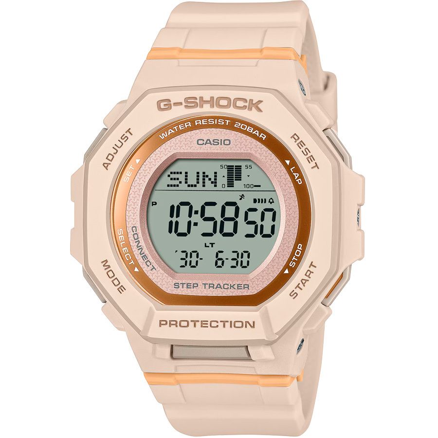 Женские кварцевые электронные наручные часы. Серия Casio G-Shock. Противоударный корпус защищает механизм часов от ударов и вибрации. Часы оснащены беспроводной технологией Bluetooth® со сверхнизким потреблением энергии для синхронизации со смартфоном. При подключении к смартфону часы автоматически корректируют текущее время и получают доступ к ряду полезных функций. Автоматическая светодиодная подсветка с функцией послесвечения.: поворот руки при недостаточном освещении обеспечит автоматическое включение подсветки дисплея. Выбираемая длительность подсветки 1,5 или 3 секунды. Шагомер от 0 до 999 999 шагов, отображение прогресса цели по количеству шагов (диапазон установки цели по количеству шагов от 1000 до 50 000, с шагом 1000 шагов), график количества шагов (почасовое количество шагов за последние 7 часов на 6-уровневом графике), индикатор шагов. Секундомер с точностью показаний 1/100 секунды и временем измерения 1 ч. Режимы измерения: прошедшее время, время круга, промежуточное время. Таймер обратного отсчета от 1 секунды до 60 минут с автоматическим повтором. 12/24х часовой формат отображения времени. 5 ежедневных будильников, 1 с функцией повтора сигнала, ежечасный сигнал. Второй часовой пояс. Включение/выключение звука кнопок. Функция поиска телефона. Автоматический календарь до 2099 года. Журнал тренировок. Анализ статуса тренировок. История активности. Функция энергосбережения. Оповещение о низком заряде батареи. Круглый корпус из биопластика розового цвета. Размеры корпуса 43,8 мм на 46,4 мм, толщина 12 мм. Устойчивое к мелким механическим повреждениям минеральное стекло. Розовый ремешок из биопластика. Приблизительный срок службы батареи 2 года. Водонепроницаемость 200 WR (плавание и ныряние без акваланга). Вес около 41 г.