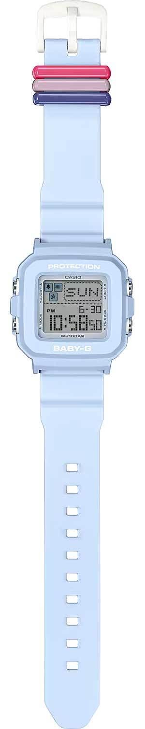 Женские кварцевые электронные часы. Коллекция Baby-G+. Противоударный корпус защищает механизм часов от ударов и вибрации. Светодиодная подсветка с функцией послесвечения. Продолжительность свечения 2 секунды. При нажатии кнопки подсветки в режиме текущего времени, на ЖК-дисплее в случайном порядке появляется серия пиксельных анимаций (серфер, танцор, дельфин, иглобрюхая рыба, собака, кошка). Секундомер с точностью показаний 1/100 с и временем измерения 24 часа. Режимы измерения: прошедшее время, промежуточное время, два финишных результата. Таймер обратного отсчета от 1 с до 24 часов с автоповтором. 12-ти и 24-х часовой формат отображения времени. 5 ежедневных будильников, почасовой сигнал времени. Мировое время: 29 часовых поясов (30 городов), включение/отключение летнего времени. Автоматический календарь до 2099 г. Включение/выключение звука кнопок. Прямоугольный корпус из полимерного пластика голубого цвета. Размер корпуса 39 мм на 42,8 мм , толщина 14,7 мм. Голубой пластиковый сплошной ремешок с классической застежкой. Минеральное стекло устойчивое к мелким механическим повреждениям. В комплекте сменные разноцветные петли для ремешка. Водостойкость WR 100 (плавание и ныряние без акваланга). Вес примерно 34 г.