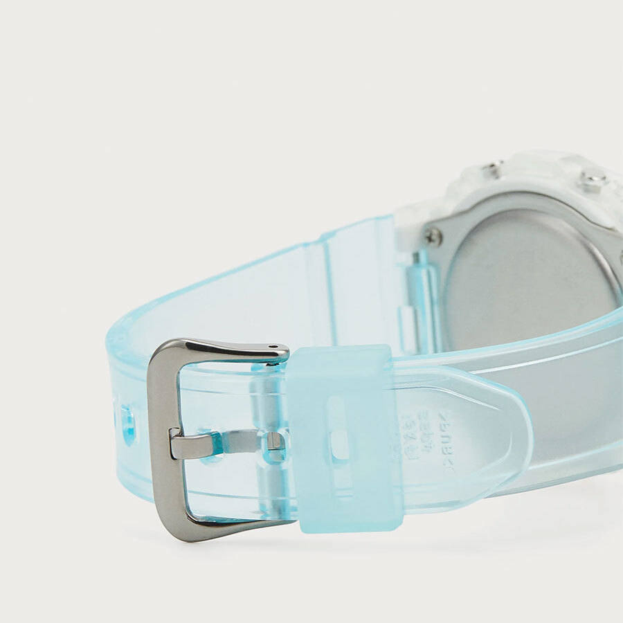 Женские кварцевые часы с цифровой индикацией времени. Коллекция Baby-G. Противоударный корпус защищает механизм часов от ударов и вибрации. Светодиодная подсветка с функцией послесвечения. Световая индикация сигнала (LED-индикатор) - светодиодная лампочка мигает при сигнале будильника, окончании таймера обратного отсчета или секундомера. Секундомер с точностью показаний 1/100 секунды (первый час), 1 секунда (через 1 час) и временем измерения 24 часа. Режимы измерения: прошедшее время, промежуточное время, два финишных результата. Таймер обратного отсчета от 1 минуты до 24 часов (с интервалом в 1 минуту) с автоповтором. Продолжительность сигнала окончания работы таймера 10 секунд. 12-ти и 24-х часовой формат отображения времени. Будильник с многофункциональными звуковыми сигналами, ежечасный сигнал. Автоматический календарь до 2099 г. Прямоугольный корпус из полупрозрачного полимерного пластика белого цвета. Размер корпуса 42,1 мм на 37,9 мм, толщина 11,3 мм. Минеральное стекло устойчивое к мелким механическим повреждениям. Ремешок из полупрозрачного полимерного пластика голубого цвета, стандартная застежка buckle. Батарея рассчитана на 3 года. Стальная задняя крышка. Водонепроницаемость WR100 (часы подходят для плавания с маской и трубкой, обычного плавания). Вес около 30 г.