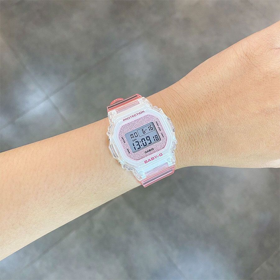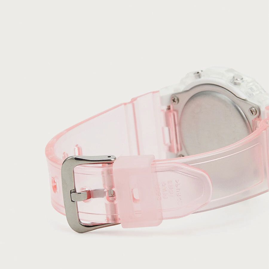Женские кварцевые часы с цифровой индикацией времени. Коллекция Baby-G. Противоударный корпус защищает механизм часов от ударов и вибрации. Светодиодная подсветка с функцией послесвечения. Световая индикация сигнала (LED-индикатор) - светодиодная лампочка мигает при сигнале будильника, окончании таймера обратного отсчета или секундомера. Секундомер с точностью показаний 1/100 секунды (первый час), 1 секунда (через 1 час) и временем измерения 24 часа. Режимы измерения: прошедшее время, промежуточное время, два финишных результата. Таймер обратного отсчета от 1 минуты до 24 часов (с интервалом в 1 минуту) с автоповтором. Продолжительность сигнала окончания работы таймера 10 секунд. 12-ти и 24-х часовой формат отображения времени. Будильник с многофункциональными звуковыми сигналами, ежечасный сигнал. Автоматический календарь до 2099 г. Прямоугольный корпус из полупрозрачного полимерного пластика белого цвета. Размер корпуса 42,1 мм на 37,9 мм, толщина 11,3 мм. Минеральное стекло устойчивое к мелким механическим повреждениям. Ремешок из полупрозрачного полимерного пластика розового цвета, стандартная застежка buckle. Батарея рассчитана на 3 года. Стальная задняя крышка. Водонепроницаемость WR100 (часы подходят для плавания с маской и трубкой, обычного плавания). Вес около 30 г.