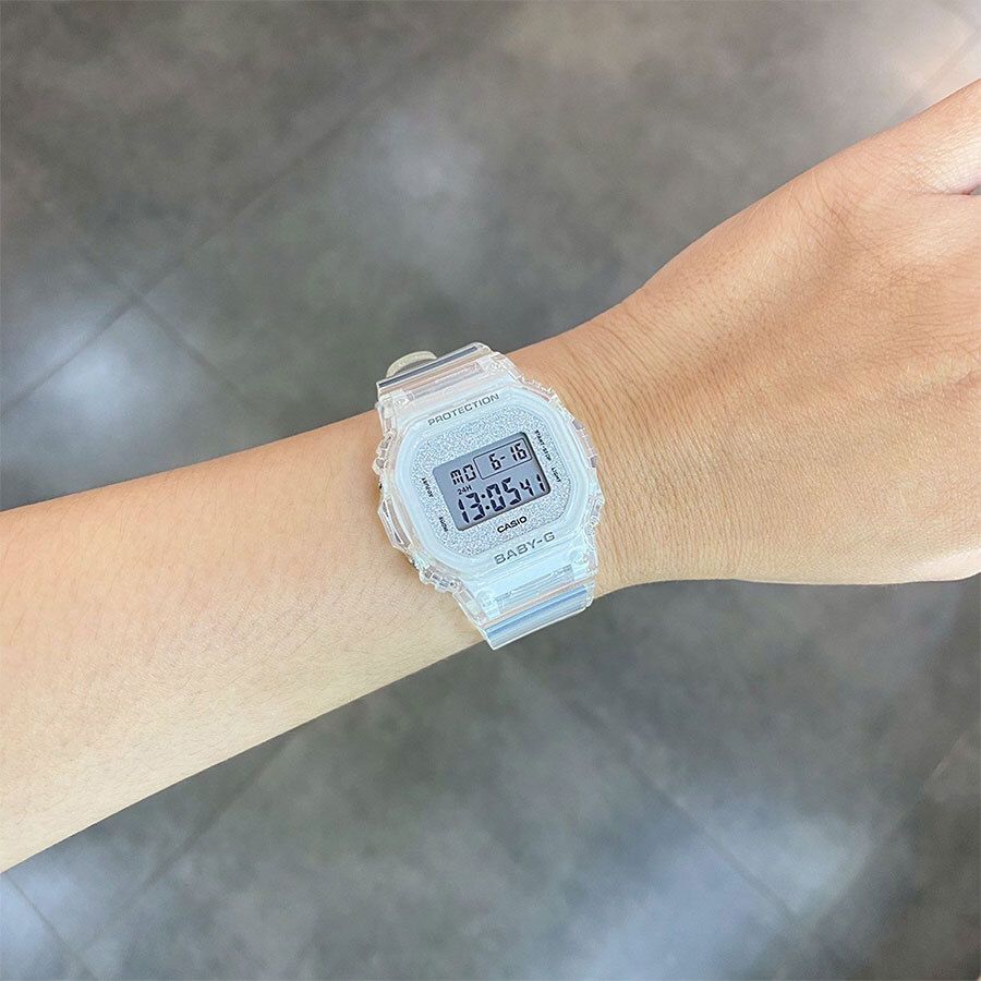 Женские кварцевые часы с цифровой индикацией времени. Коллекция Baby-G. Противоударный корпус защищает механизм часов от ударов и вибрации. Светодиодная подсветка с функцией послесвечения. Световая индикация сигнала (LED-индикатор) - светодиодная лампочка мигает при сигнале будильника, окончании таймера обратного отсчета или секундомера. Секундомер с точностью показаний 1/100 секунды (первый час), 1 секунда (через 1 час) и временем измерения 24 часа. Режимы измерения: прошедшее время, промежуточное время, два финишных результата. Таймер обратного отсчета от 1 минуты до 24 часов (с интервалом в 1 минуту) с автоповтором. Продолжительность сигнала окончания работы таймера 10 секунд. 12-ти и 24-х часовой формат отображения времени. Будильник с многофункциональными звуковыми сигналами, ежечасный сигнал. Автоматический календарь до 2099 г. Прямоугольный корпус из полупрозрачного полимерного пластика белого цвета. Размер корпуса 42,1 мм на 37,9 мм, толщина 11,3 мм. Минеральное стекло устойчивое к мелким механическим повреждениям. Ремешок из полупрозрачного полимерного пластика белого цвета, стандартная застежка buckle. Батарея рассчитана на 3 года. Стальная задняя крышка. Водонепроницаемость WR100 (часы подходят для плавания с маской и трубкой, обычного плавания). Вес около 30 г.