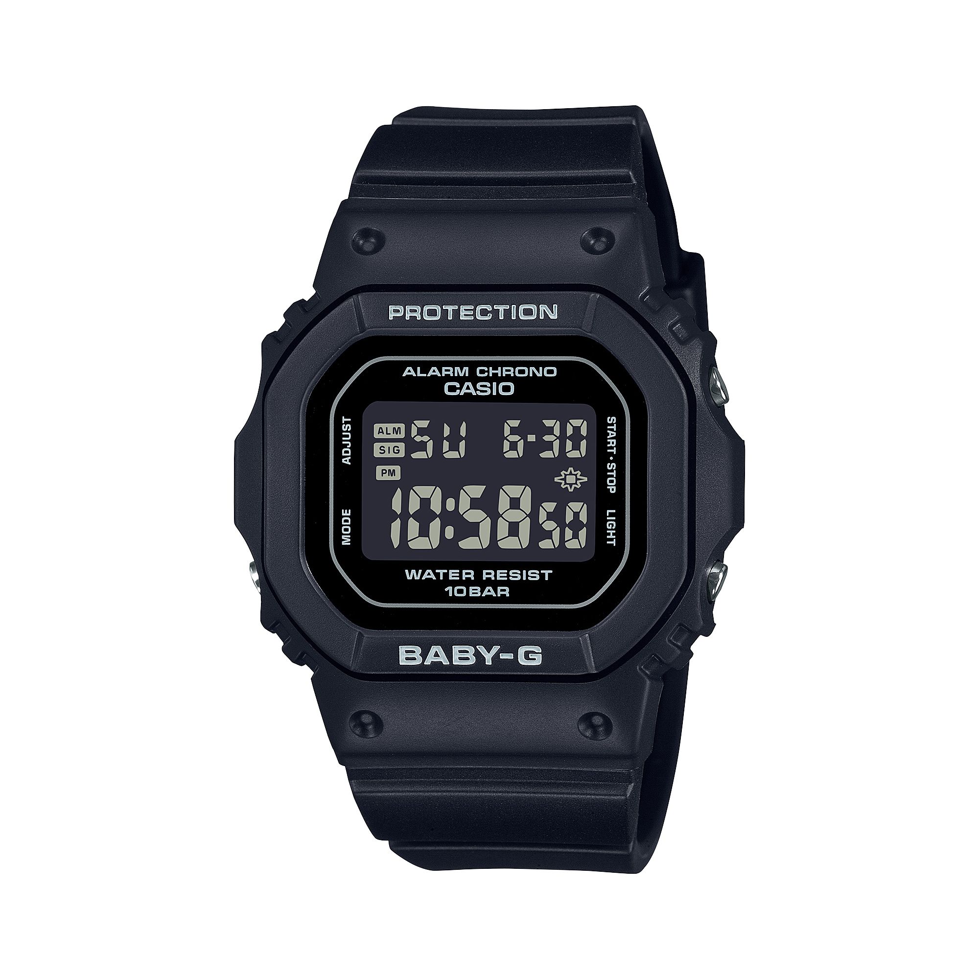 Женские кварцевые электронные часы. Коллекция Baby-G. Противоударный корпус защищает механизм часов от ударов и вибрации. Светодиодная подсветка с функцией послесвечения. Световой сигнал (LED-индикатор) - светодиодная лампочка начинает мигать при сигнале будильника, окончании таймера обратного отсчета или секундомера. Секундомер с точностью показаний 1/100 секунды (первый час), 1 секунда (через 1 час) и пределом измерения 24 часа. Режимы измерения: прошедшее время, промежуточное время, два финишных результата. Таймер обратного отсчета от 1 минуты до 24 часов (с интервалом в 1 минуту) с автоповтором. 12-ти и 24-х часовой формат отображения времени. Многофункциональный будильник: сигналы ежедневный, ежемесячный, каждый день определенного месяца, на определенную дату. Ежечасный сигнал. Автоматический календарь до 2099 г. Прямоугольный корпус из полимерного пластика чёрного цвета. Размер корпуса 42,1 мм x 37,9 мм , толщина 11,3 мм. Чёрный ремешок из полимерного пластика, стандартная застежка. Прочное минеральное стекло устойчивое к мелким механическим повреждениям. Водостойкость WR 100 (плавание и ныряние без акваланга). Вес примерно 30 г.