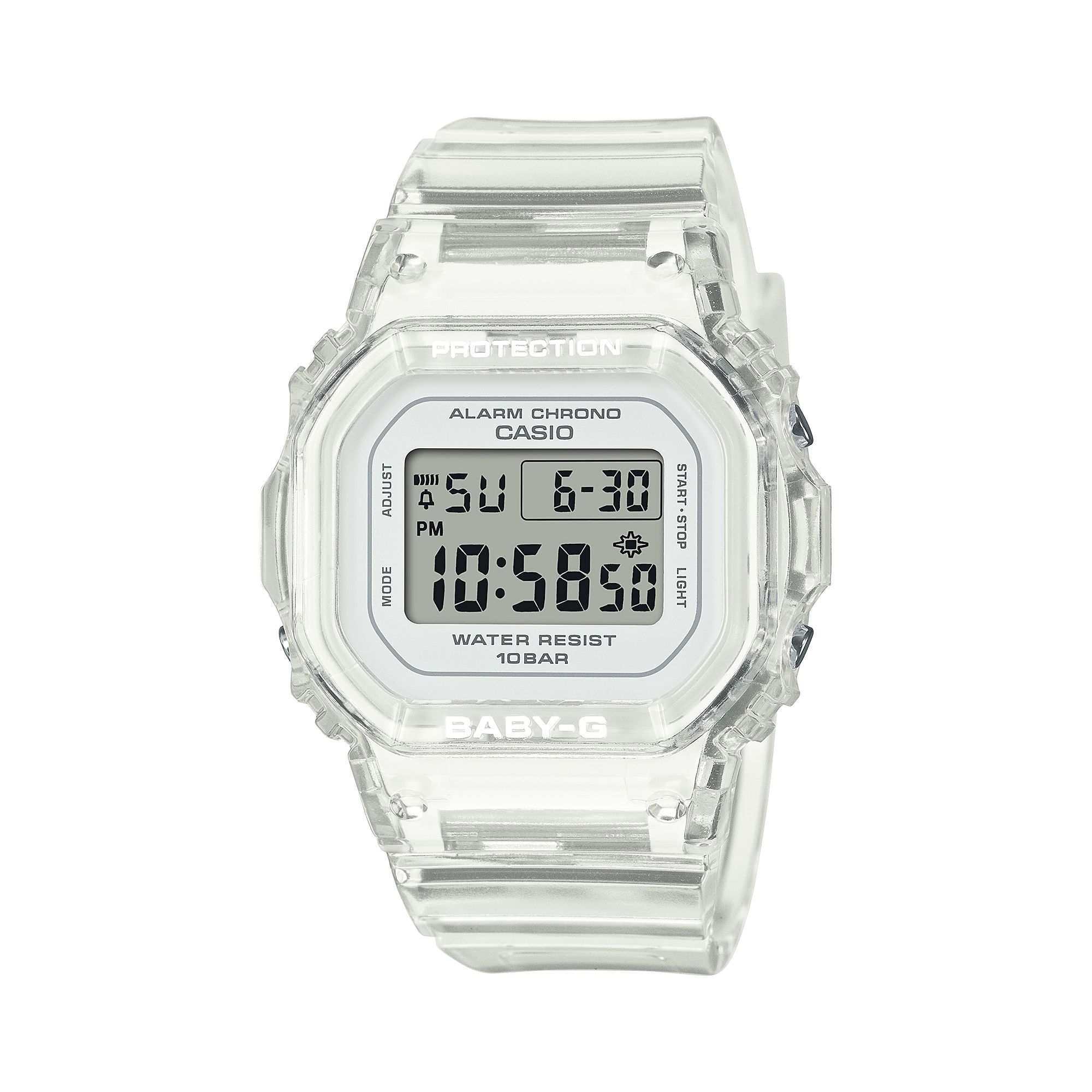 Женские кварцевые электронные часы. Коллекция Baby-G. Противоударный корпус защищает механизм часов от ударов и вибрации. Светодиодная подсветка с функцией послесвечения. Световой сигнал (LED-индикатор) - светодиодная лампочка начинает мигать при сигнале будильника, окончании таймера обратного отсчета или секундомера. Секундомер с точностью показаний 1/100 секунды (первый час), 1 секунда (через 1 час) и пределом измерения 24 часа. Режимы измерения: прошедшее время, промежуточное время, два финишных результата. Таймер обратного отсчета от 1 минуты до 24 часов (с интервалом в 1 минуту) с автоповтором. 12-ти и 24-х часовой формат отображения времени. Многофункциональный будильник: сигналы ежедневный, ежемесячный, каждый день определенного месяца, на определенную дату. Ежечасный сигнал. Автоматический календарь до 2099 г. Прямоугольный корпус из полимерного полупрозрачного пластика. Размер корпуса 42,1 мм x 37,9 мм , толщина 11,3 мм. Полупрозрачный ремешок из полимерного пластика, стандартная застежка. Прочное минеральное стекло устойчивое к мелким механическим повреждениям. Водостойкость WR 100 (плавание и ныряние без акваланга). Вес примерно 30 г.