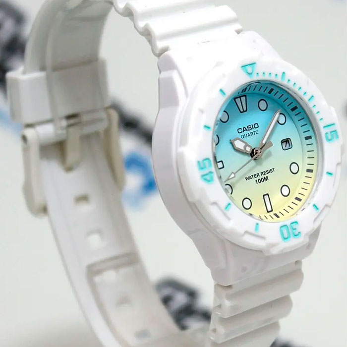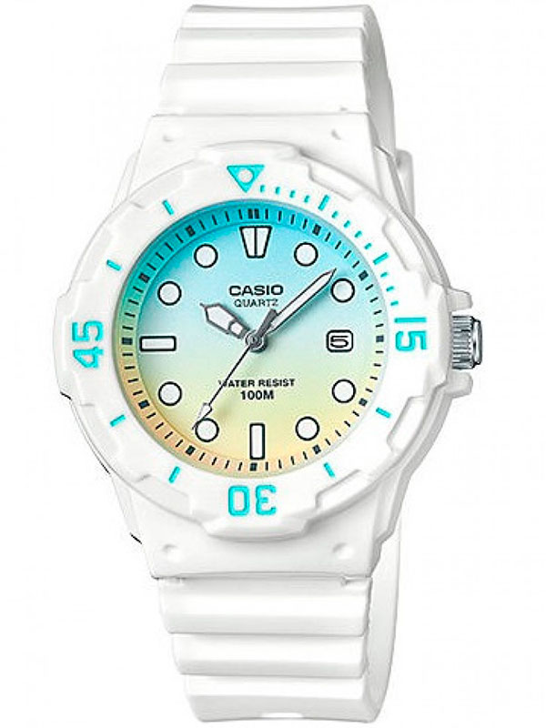 Женские кварцевые наручные часы с аналоговым отображением времени. Серия Casio Collection. Стильная и практичная модель для повседневного использования и активного отдыха. Компактный корпус и лаконичный дизайн делают часы универсальным аксессуаром для любого образа. Центральные часовая, минутная и секундная стрелки. Циферблат с часовыми метками в виде точек и штрихов. Стрелки и часовые метки с люминесцентным покрытием, которое светится в темноте после непродолжительного воздействия света. Индикация даты в позиции 3 часов. Пластиковое стекло. Круглый корпус из полимерного пластика белого цвета. Размеры корпуса 34,2 мм на 38,9мм, толщина 11,5мм. Вращающийся безель с минутной шкалой. Переводная головка с защитой. Белый пластиковый ремешок с классической застёжкой buckle. Батарейка рассчитана на 3 года. Водонепроницаемость 100WR (часы подходят для плавания с маской, трубкой, обычного плавания). Вес около 25 г.