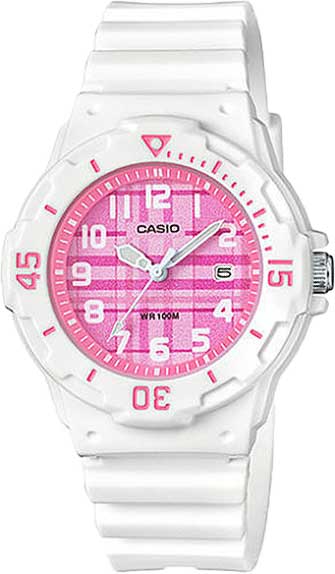Женские кварцевые наручные часы с аналоговым отображением времени. Серия Casio Collection. Яркие часы в спортивном стиле для активного отдыха. Центральные часовая, минутная и секундная стрелки. Розовый циферблат с часовыми метками в виде арабских цифр. Стрелки с люминесцентным покрытием, которое светится в темноте после непродолжительного воздействия света. Индикация даты в позиции 3 часов. Пластиковое стекло. Круглый корпус из полимерного пластика белого цвета. Размеры корпуса 34,2 мм на 38,9мм, толщина 11,5мм. Вращающийся безель с минутной шкалой. Переводная головка с защитой. Белый пластиковый ремешок с классической застёжкой buckle. Батарейка рассчитана на 3 года. Водонепроницаемость 100WR (часы подходят для плавания с маской, трубкой, обычного плавания). Вес около 25 г.