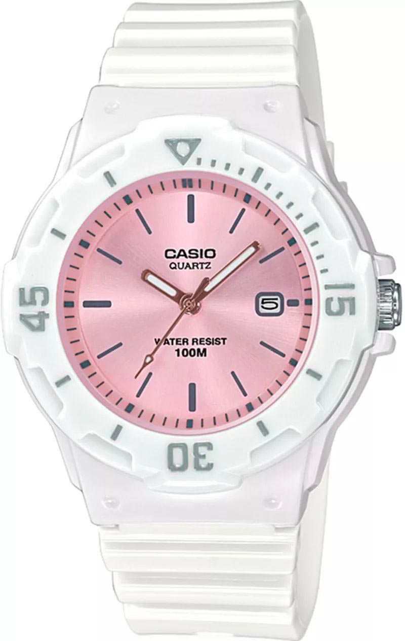 Женские кварцевые наручные часы с аналоговым отображением времени. Серия Casio Collection. Стильная и практичная модель для повседневного использования и активного отдыха. Компактный корпус и лаконичный дизайн делают часы универсальным аксессуаром для любого образа. Центральные часовая, минутная и секундная стрелки. Розовый циферблат с часовыми метками в виде штрихов. Стрелки с люминесцентным покрытием, которое светится в темноте после непродолжительного воздействия света. Индикация даты в позиции 3 часов. Пластиковое стекло. Круглый корпус из полимерного пластика белого цвета. Размеры корпуса 34,2 мм на 38,9мм, толщина 11,5мм. Вращающийся безель с минутной шкалой. Переводная головка с защитой. Белый пластиковый ремешок с классической застёжкой buckle. Батарейка рассчитана на 3 года. Водонепроницаемость 100WR (часы подходят для плавания с маской, трубкой, обычного плавания). Вес около 25 г.