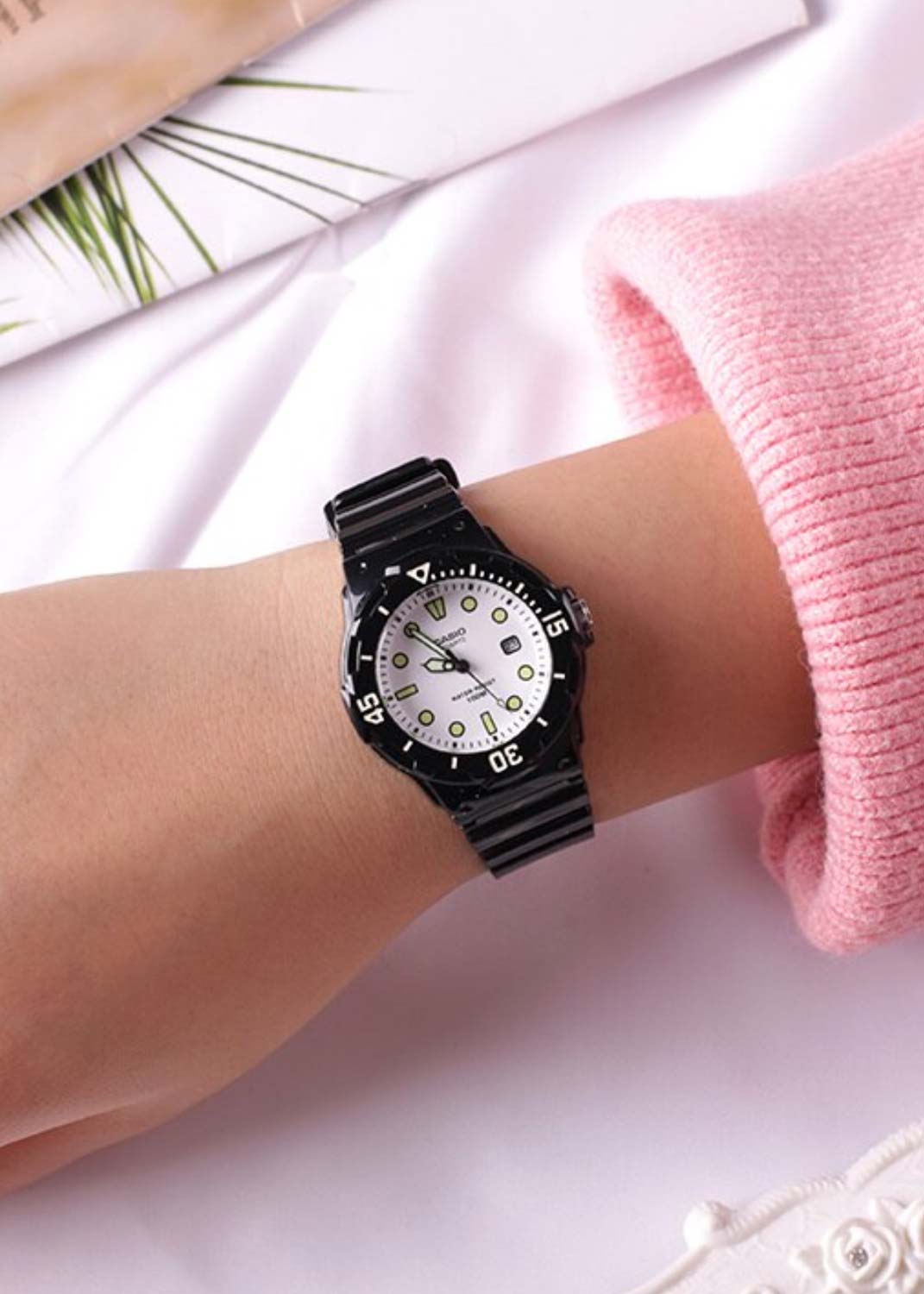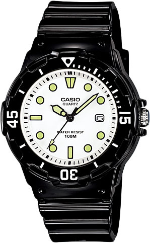 Женские кварцевые наручные часы с аналоговым отображением времени. Серия Casio Collection. Стильная и практичная модель для повседневного использования и активного отдыха. Компактный корпус и лаконичный дизайн делают часы универсальным аксессуаром для любого образа. Центральные часовая, минутная и секундная стрелки. Белый циферблат с часовыми метками в виде точек и штрихов. Стрелки и часовые метки с люминесцентным покрытием, которое светится в темноте после непродолжительного воздействия света. Индикация даты в позиции 3 часов. Пластиковое стекло. Круглый корпус из полимерного пластика чёрного цвета. Размеры корпуса 34,2 мм на 38,9мм, толщина 11,5мм. Вращающийся безель с минутной шкалой. Переводная головка с защитой. Чёрный пластиковый ремешок с классической застёжкой buckle. Батарейка рассчитана на 3 года. Водонепроницаемость 100WR (часы подходят для плавания с маской, трубкой, обычного плавания). Вес около 25 г.