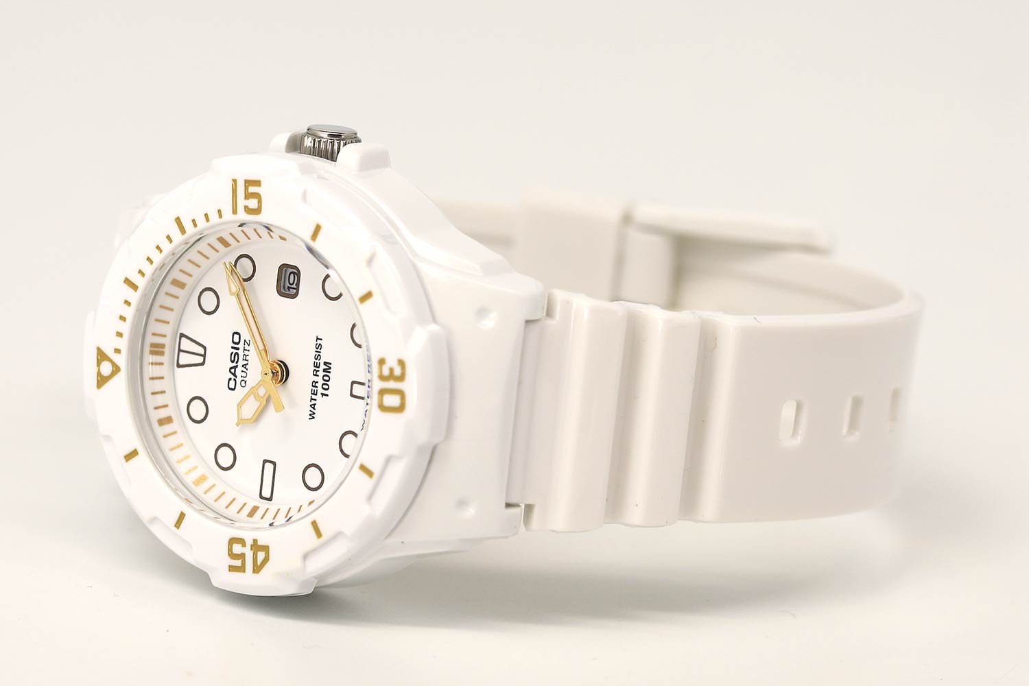 Женские кварцевые наручные часы с аналоговым отображением времени. Серия Casio Collection. Стильная и практичная модель для повседневного использования и активного отдыха. Компактный корпус и лаконичный дизайн делают часы универсальным аксессуаром для любого образа. Центральные часовая, минутная и секундная стрелки. Белый циферблат с часовыми метками в виде точек и штрихов. Стрелки и часовые метки с люминесцентным покрытием, которое светится в темноте после непродолжительного воздействия света. Индикация даты в позиции 3 часов. Пластиковое стекло. Круглый корпус из полимерного пластика белого цвета. Размеры корпуса 34,2 мм на 38,9мм, толщина 11,5мм. Вращающийся безель с минутной шкалой. Переводная головка с защитой. Белый пластиковый ремешок с классической застёжкой buckle. Батарейка рассчитана на 3 года. Водонепроницаемость 100WR (часы подходят для плавания с маской, трубкой, обычного плавания). Вес около 25 г.
