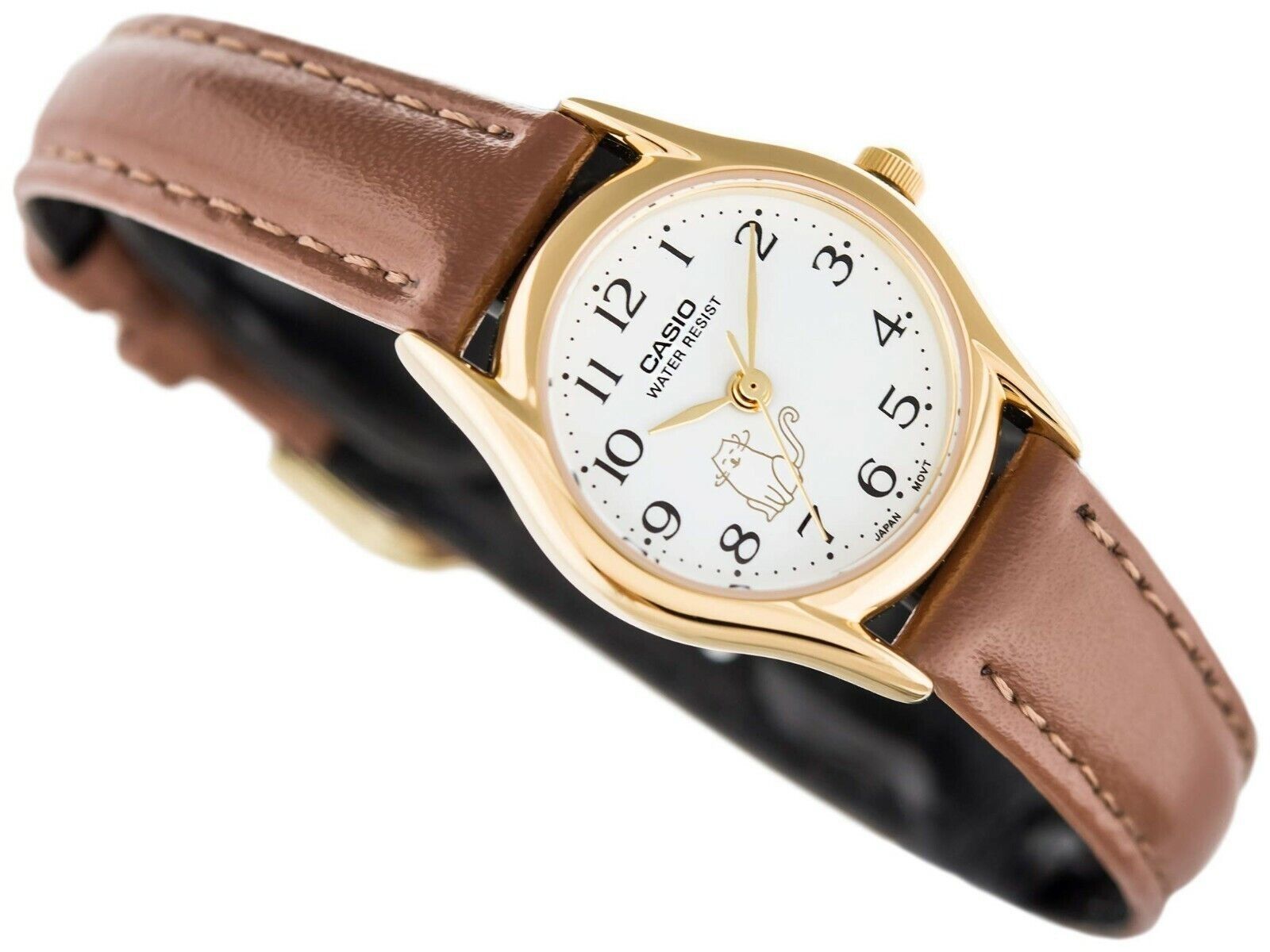 Женские кварцевые аналоговые наручные часы. Серия Casio Collection. Центральные часовая, минутная и секундная стрелки. Белый циферблат с часовыми метками в виде арабских цифр. Циферблат украшен изображением котика. Круглый корпус из нержавеющей стали с IP покрытием цвета жёлтого золота. Размеры корпуса 25 мм на 20 мм, толщина 9.2 мм. Рифлёная переводная. Устойчивое к мелким механическим повреждениям минеральное стекло. Коричневый кожаный ремешок с классической застёжкой buckle. Батарейка рассчитана на 3 года. Водонепроницаемость 30WR (защита от брызг). Вес около 24 г.