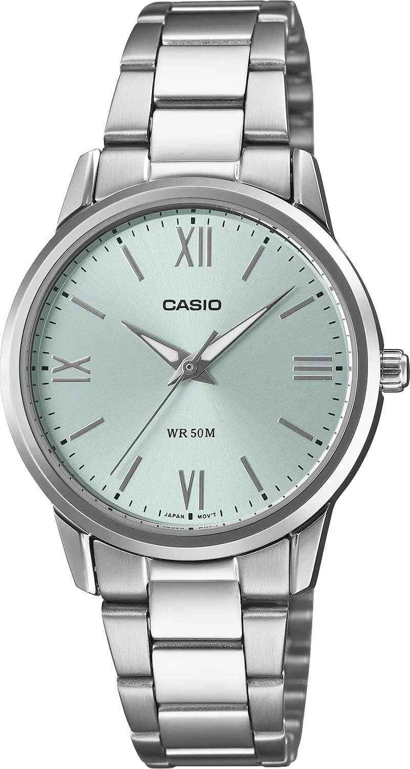 Женские кварцевые наручные часы с аналоговым отображением времени. Серия Standard Analog Collection. Центральные часовая, минутная и секундная стрелки. Голубой циферблат с часовыми метками в виде штрихов и четырёх римских цифр XII, III, VI и IX. Стрелки с люминесцентным покрытием, которое светится в темноте после непродолжительного воздействия света. Устойчивое к мелким механическим повреждениям минеральное стекло. Круглый стальной корпус размером 30,5 мм на 35,5мм, толщиной 7,5 мм. Браслет из нержавеющей стали с тройной раскладывающейся застежкой. Батарея рассчитана на 3 года. Водонепроницаемость 50WR (мытьё рук, дождь). Вес около 57 г.