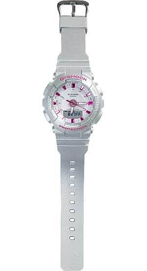 Женские кварцевые аналого-цифровые наручные часы. Серия Casio G-Shock Neo Punk. Противоударный корпус защищает механизм часов от ударов и вибрации. Двойная светодиодная подсветка Super Illuminator обеспечивает подсветку не только аналогового циферблата, но и цифрового дисплея. Настраиваемое послесвечение 1,5 с или 3с. Необритовое светонакопительное покрытие стрелок обеспечивает длительное послесвечение в темноте после непродолжительного воздействия света. 12/24-часовой формат отображения времени. Секундомер с точностью показаний 1/100 секунды (первые 60 минут) 1 секунда (через 60 минут) и временем измерения 24 ч. Режимы измерения: прошедшее время, время прохождения дистанции, сохранение в памяти до 30 результатов времени прохождения дистанции. Таймер обратного отсчета от 1 мин до 100 мин с автоповтором. 5 ежедневных будильников, ежечасный сигнал. Шагомер. История подсчета шагов: ежедневные данные (8 дней), еженедельные данные (4 недели) , количество дней достижения цели подсчета шагов. График подсчета шагов за последние 5 часов. Шагомер (измеряет количество шагов от 0 до 999999). История подсчета шагов: ежедневные данные (8 дней), еженедельные данные (4 недели). Графическое отображение пройденных шагов за последние 5ч. Настройка ежедневной нормы по количеству шагов: интервал настройки 1000 шагов, диапазон настройки от 1000 до 50 000 шагов, уведомление о достижении нормы по количеству шагов. Звуковое напоминание об отсутствии активности. Функция сохранения энергии (автоматический переход датчика в спящий режим после фиксированного периода бездействия). Автоматический календарь до 2099 года. Второй часовой пояс. Функция отключения/включения звука кнопок. Функция перемещения стрелок для удобного просмотра информации на цифровом экране. Круглый корпус из пластика серебристого цвета. Размер корпуса 45,9 мм на 49мм, толщина 15,8мм. Устойчивое к мелким механическим повреждениям минеральное стекло. Пластиковый ремешок серебристого цвета с классической застёжкой buckle. Батарея рассчитана на 2 года. Водонепроницаемость 200WR (плавание и погружение без акваланга). Вес приблизительно 53 г.