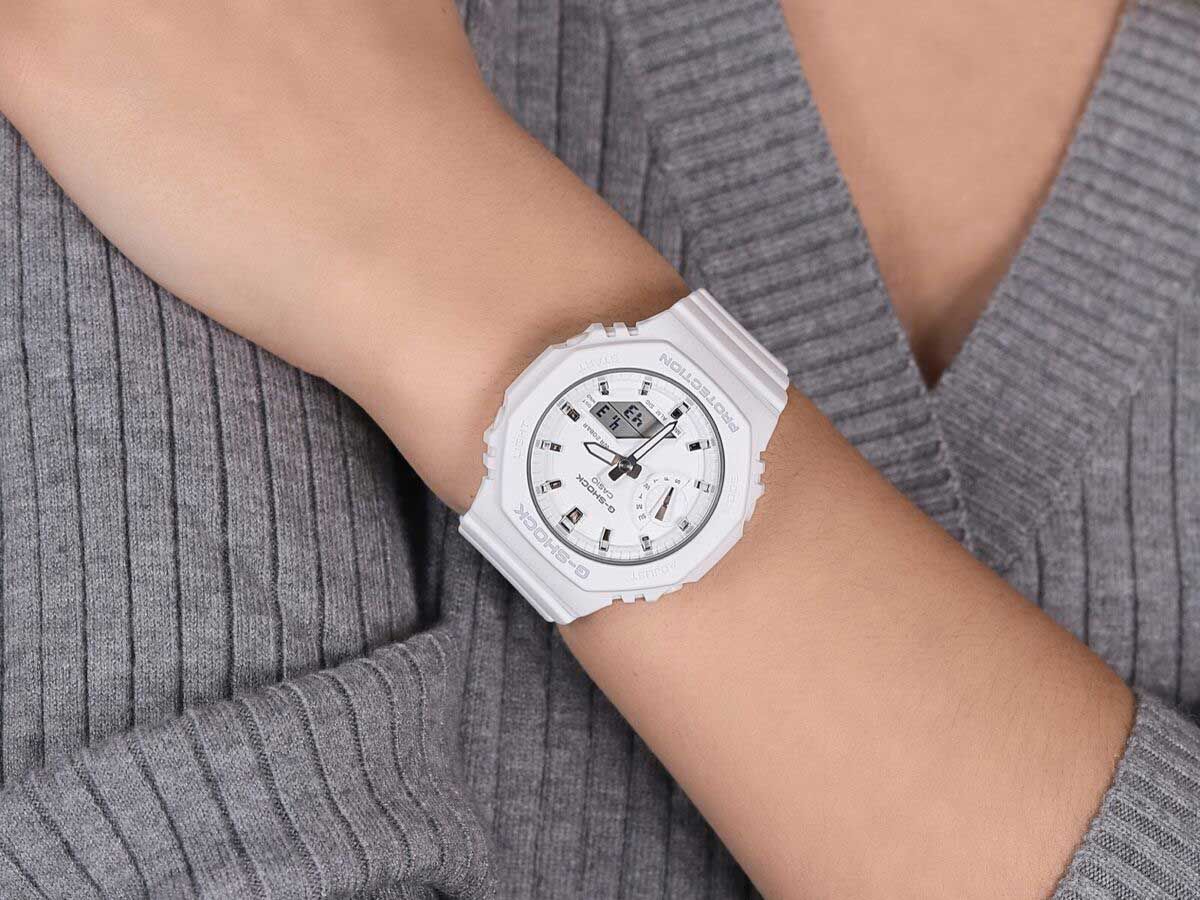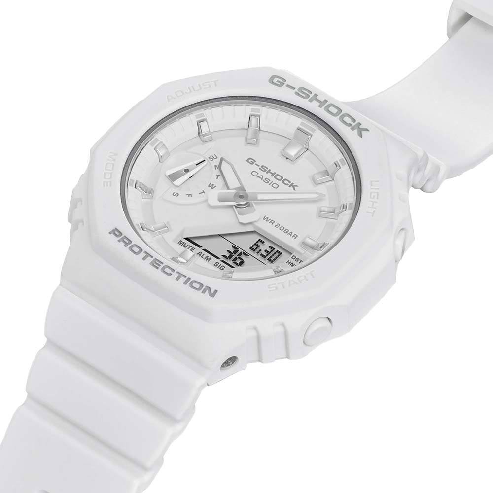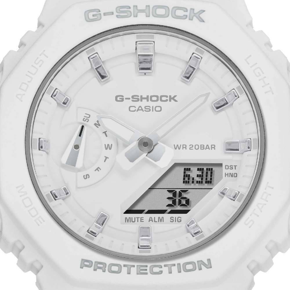 Женские кварцевые аналого-цифровые наручные часы. Серия G-Shock. Противоударный пластиковый корпус с углеродными волокнами (структура Carbon Core Guard) более прочный и в то же время более легкий, защищает механизм часов от ударов и вибраций. Двойная светодиодная подсветка обеспечивает подсветку не только цифрового дисплея, но и аналогового циферблата. Настройка продолжительности подсветки 1,5 или 3 секунды, послесвечение. Светящееся покрытие стрелок обеспечивает длительное послесвечение в темноте даже после короткого воздействия света. Аналоговое отображение времени (центральные часовая и секундная стрелки). Электронные дата и день недели. 12-ти и 24-х часовой формат отображения времени. Секундомер с точностью показаний 1/100 с (первый час) и 1 с (после первого часа) и временем измерения 24 часа. Режимы измерения: прошедшее время, промежуточное время, два финишных результата. Таймер обратного отсчета от 1 секунды до 24 часов (с интервалом в 1 секунду) с автоповтором. Мировое время - 31 часовой пояс (48 городов), всемирное координированное время (UTC), включение/отключение летнего времени. 5 ежедневных будильников, ежечасный сигнал. Функция перемещения стрелок для удобного просмотра информации на цифровом экране. Ретроградный стрелочный указатель для недели. Функция отключения/включения звука кнопок. Автоматический календарь до 2099 года. Усиленный углеродными волокнами пластиковый восьмиугольный корпус белого цвета. Размер корпуса 42,9 мм на 46,2мм, толщина 11,2мм. Устойчивое к мелким механическим повреждениям минеральное стекло. Белый пластиковый ремешок со стандартной застёжкой Buckle. Примерный срок службы батареи 3 года. Водонепроницаемость 200WR (плавание и ныряние без акваланга). Вес около 41 г.