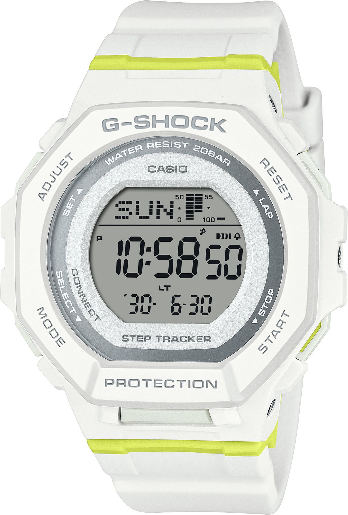 Женские кварцевые электронные наручные часы. Серия Casio G-Shock. Противоударный корпус защищает механизм часов от ударов и вибрации. Часы оснащены беспроводной технологией Bluetooth® со сверхнизким потреблением энергии для синхронизации со смартфоном. При подключении к смартфону часы автоматически корректируют текущее время и получают доступ к ряду полезных функций. Автоматическая светодиодная подсветка с функцией послесвечения: поворот руки при недостаточном освещении обеспечит автоматическое включение подсветки дисплея. Выбираемая длительность подсветки 1,5 или 3 секунды. Шагомер от 0 до 999 999 шагов, отображение прогресса цели по количеству шагов (диапазон установки цели по количеству шагов от 1000 до 50 000, с шагом 1000 шагов), график количества шагов (почасовое количество шагов за последние 7 часов на 6-ти уровневом графике), индикатор шагов. Секундомер с точностью показаний 1/100 секунды и временем измерения 1 ч. Режимы измерения: прошедшее время, время круга, промежуточное время. Память на 200 кругов. Таймер обратного отсчета от 1 секунды до 60 минут с автоматическим повтором. 12/24х часовой формат отображения времени. 5 ежедневных будильников, один с функцией повтора сигнала, ежечасный сигнал. Второй часовой пояс. Включение/выключение звука кнопок. Функция поиска телефона. Автоматический календарь до 2099 года. Журнал тренировок. Анализ статуса тренировок. История активности. Функция энергосбережения. Оповещение о низком заряде батареи. Круглый корпус из биопластика (изготавливается из возобновляемых органических ресурсов ) белого цвета. Размер корпуса 43,8 мм на 46,4 мм, толщина 12 мм. Устойчивое к мелким механическим повреждениям минеральное стекло. Белый ремешок из биопластика (изготавливается из возобновляемых органических ресурсов). Батарея рассчитана на 2 года. Водонепроницаемость 200WR (плавание и ныряние без акваланга). Вес около 41 г.