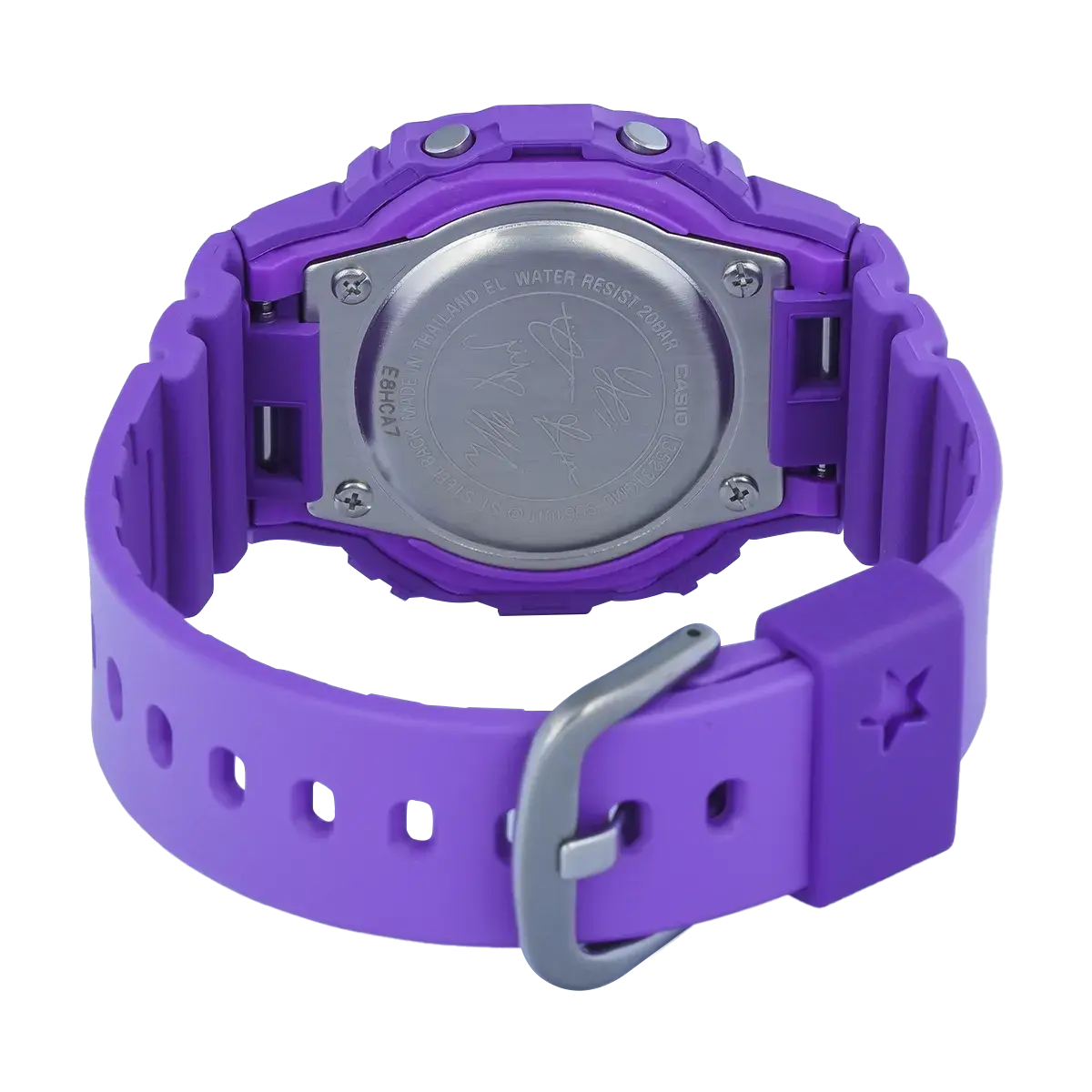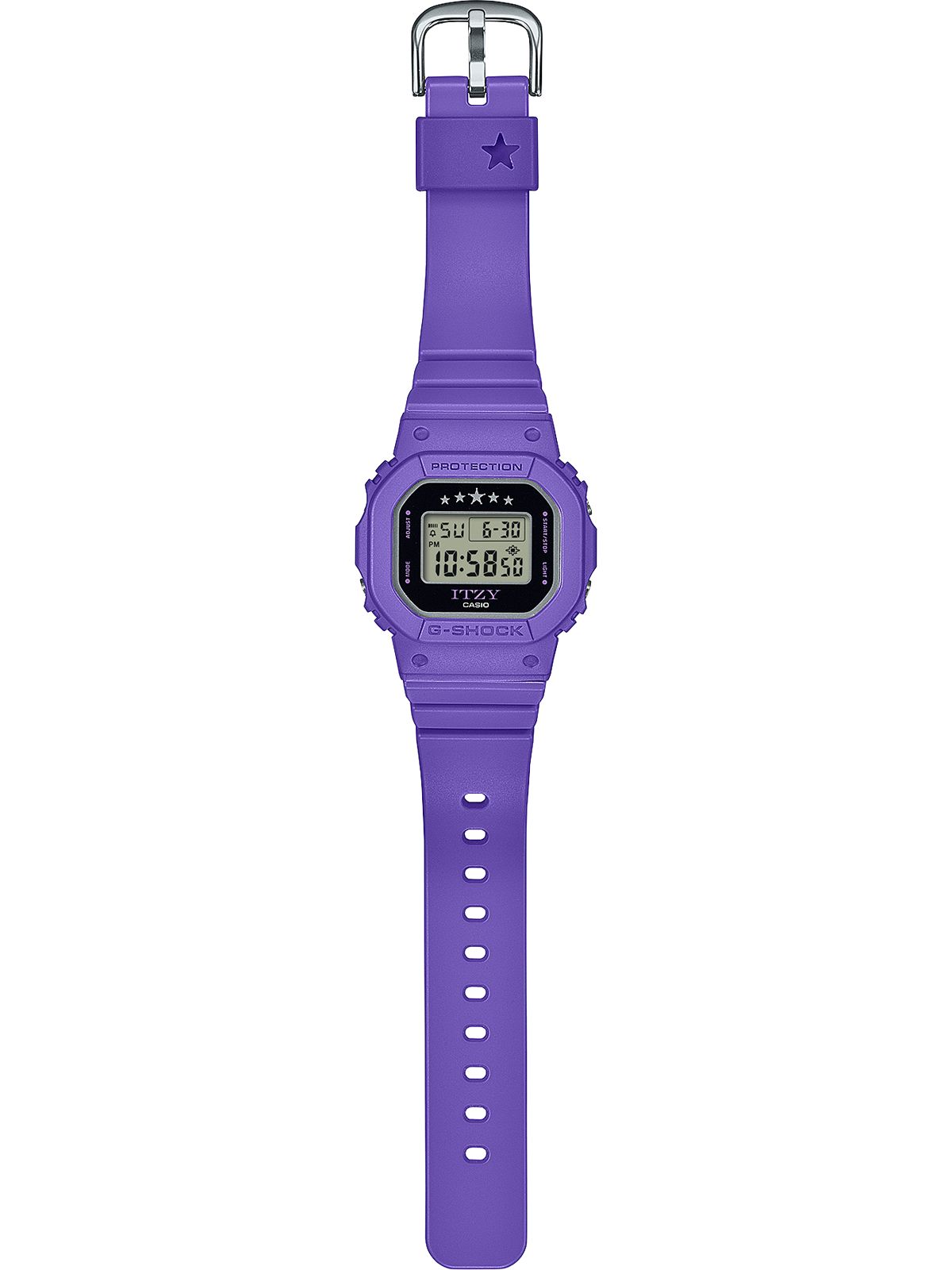 Женские электронные кварцевые наручные часы. Серия Casio G-Shock limited. Модель выпущена в сотрудничестве G-Shock и Itzy — популярной южнокорейской гёрл-группы жанра K-pop. Логотип группы Itzy украшает нижнюю часть циферблата часов, а на верхней нарисованы 5 звезд — по количеству участниц группы. Противоударный корпус защищает механизм часов от ударов и вибрации. Дисплей подсвечивается ярким светодиодом с функцией послесвечения. При включении подсветки на дисплее появляются 5 сердечек. Световая индикация сигнала (LED-индикатор) - светодиодная лампочка мигает при сигнале будильника, окончании таймера обратного отсчета или секундомера. 12-ти и 24-х часовой формат отображения времени. Секундомер с точностью показаний 1/100 секунды (первый час), 1 секунда (через 1 час) и временем измерения 24 часа. Режимы измерения: прошедшее время, промежуточное время, два финишных результата. Таймер обратного отсчета от 1 секунды до 24 часов с автоповтором. Многофункциональный будильник, ежечасный сигнал. Автоматический календарь до 2099 года. Прямоугольный корпус из биопластика (изготавливается из возобновляемых органических ресурсов)фиолетового цвета. Размеры корпуса 40,5 мм на 45,7мм, толщина 11,9мм. Устойчивое к мелким механическим повреждениям минеральное стекло. Фиолетовый ремешок из биопластика (изготавливается из возобновляемых органических ресурсов) с классической застежкой Buckle. Батарейка рассчитана на 3 года. На стальной задней крышке часов выгравированы пять автографов участниц группы Itzy. Водонепроницаемость 200WR (плавание и ныряние без акваланга). Вес около 42 г. Часы поставляются в специальной упаковке, украшенной логотипами ITZY и G-SHOCK. На внешней коробке напечатаны автографы каждой из участниц группы .