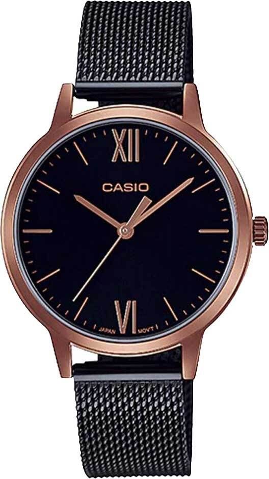 Женские кварцевые аналоговые наручные часы. Casio Collection. Центральные часовая, минутная и секундная стрелки золотистого цвета. Чёрный циферблат с часовыми метками в виде штрихов и двух римских цифр VI и XII золотистого цвета. Устойчивое к мелким механическим повреждениям минеральное стекло. Круглый стальной корпус с IP-покрытием цвета розового золота. Размер корпуса 37,5 мм на 32 мм, толщина 8 мм. Стальной браслет миланского плетения с IP-покрытием чёрного цвета, регулируемая застежка. Батарейка рассчитана на 3 года. Водонепроницаемость 30WR (защита от брызг). Вес около 47 г.