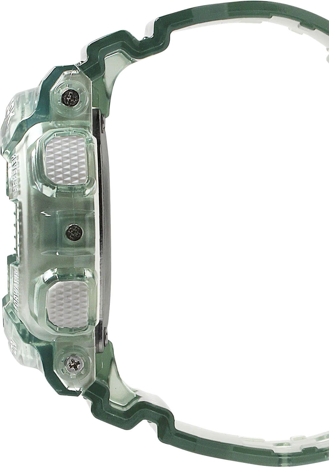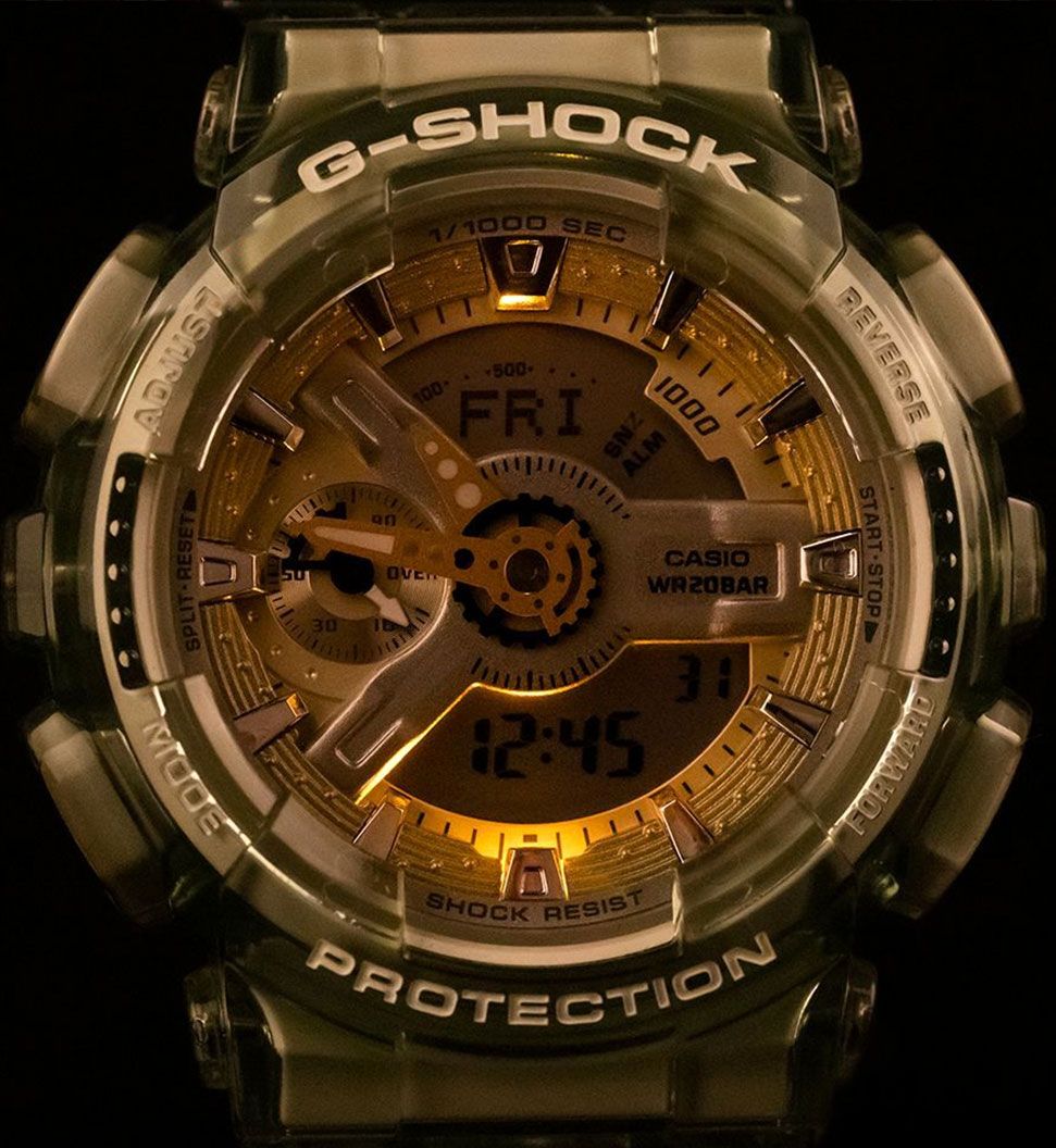 Женские кварцевые наручные часы c аналого-цифровым отображением времени. Серия Casio G-Shock S-series. Противоударный корпус защищает механизм часов от ударов и вибрации. Автоматическая светодиодная подсветка — при недостаточном освещении поворот руки включает подсветку циферблата, выбор продолжительности подсветки 1,5 секунды или 3 секунды, послесвечение. Стрелки с люминесцентным покрытием, которое светится в темноте после непродолжительного воздействия света. Мировое время – 48 городов (29 часовых поясов), всемирное координированное время (UTC), включение/отключение летнего времени, переключение между домашним и мировым временем. 12-ти и 24-х часовой формат отображения времени. Секундомер с точностью показаний 1/1000 с и временем измерения 100 ч. Режимы измерения: пройденное время, время круга, промежуточное время. Расчет скорости по выбранной дистанции. Таймер обратного отсчета от 1 мин до 24 ч (с интервалом в 1 минуту и с интервалом в 1 час) с автоповтором. 5 ежедневных будильников, один с функцией повтора сигнала (Snooze), ежечасный сигнал. Автоматический календарь до 2099 года. Круглый корпус из полупрозрачного пластика зелёного цвета. Размер корпуса 45,9 мм на 49мм, толщина 15,8мм. Устойчивое к мелким механическим повреждениям минеральное стекло. Полупрозрачный пластиковый ремешок зелёного цвета с классической застежкой Buckle. Приблизительный срок службы батареи 2 года. Водонепроницаемость 200 WR (плавание и ныряние без акваланга). Вес около 56 г.
