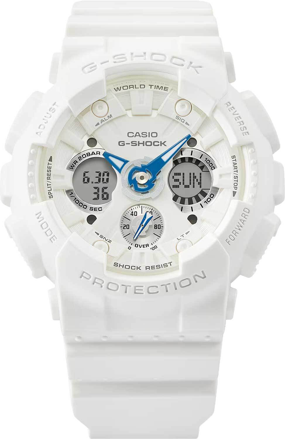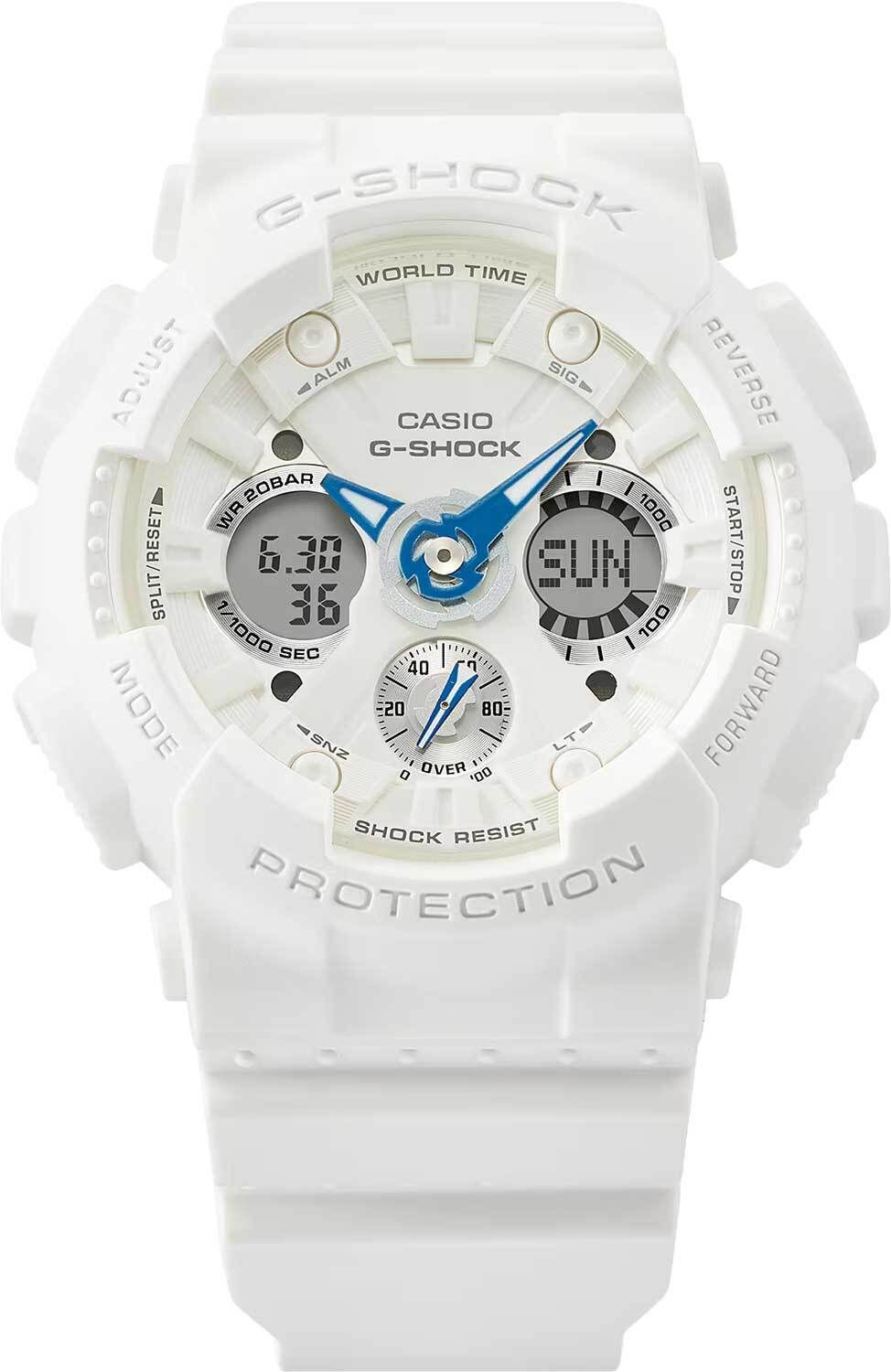 Женские кварцевые часы с аналого-цифровым отображением времени. Серия Casio G-Shock S-Series. Ударопрочная конструкция корпуса защищает механизм часов от ударов и вибрации. Часы созданы с защитой от воздействия магнитных полей. Автоматическая светодиодная подсветка — при недостаточном освещении поворот руки обеспечит автоматическое включение подсветки циферблата. Настраиваемое послесвечение 1,5 с или 3 секунды. Светонакопительное покрытие стрелок обеспечивает длительное послесвечение в темноте после кратковременного воздействия света. 12/24-часовой формат отображения времени. Секундомер с точностью показаний 1/1000 с и временем измерения 100 ч. Расчет скорости по выбранной дистанции. Таймер обратного отсчета от 1 мин до 24 ч ( (с интервалом 1 минута) с автоповтором. Мировое время - 48 городов (29 часовых поясов), всемирное координированное время (UTC). Функция включения/отключения летнего времени. Переключение между домашним и мировым временем. 5 ежедневных будильников, один с функцией повтора сигнала Snooze, ежечасный сигнал. Автоматический календарь до 2099 года. Круглый корпус из биопластика (изготавливается из возобновляемых органических ресурсов) белого цвета. Размер корпуса 45,9 мм на 49 мм, толщина 15,8мм. Устойчивое к мелким механическим повреждениям минеральное стекло. Белый ремешок из биопластика (изготавливается из возобновляемых органических ресурсов) с классической застёжкой buckle. Батарея рассчитана на 3 года. Водонепроницаемость 200WR (плавание и погружение без акваланга). Вес около 55 г.