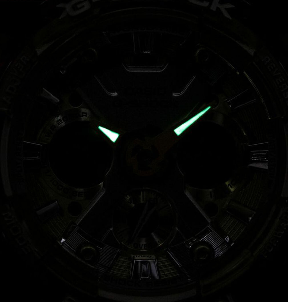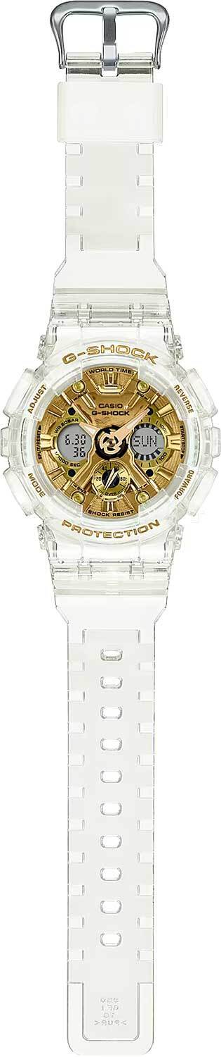 Кварцевые наручные часы c аналого-цифровым отображением времени. Серия Casio G-Shock S-series. Унисекс часы. Отличительной особенностью данной модели являются полупрозрачные ремешок и корпус часов и яркий золотистый металлизированный циферблат. Противоударный корпус защищает механизм часов от ударов и вибрации. Часы созданы с защитой от магнитных полей. Автоматическая светодиодная подсветка — при недостаточном освещении поворот руки включает подсветку циферблата, выбор продолжительности подсветки 1,5 секунды или 3 секунды, послесвечение. Стрелки с люминесцентным покрытием, которое светится в темноте после непродолжительного воздействия света. Мировое время – 48 городов (29 часовых поясов), всемирное координированное время (UTC), включение/отключение летнего времени, переключение между домашним и мировым временем. 12-ти и 24-х часовой формат отображения времени. Секундомер с точностью показаний 1/1000 с и временем измерения 100 ч. Режимы измерения: пройденное время, время круга, промежуточное время. Расчет скорости по выбранной дистанции. Таймер обратного отсчета от 1 мин до 24 ч (с интервалом в 1 минуту и с интервалом в 1 час) с автоповтором. 5 ежедневных будильников, один с функцией повтора сигнала Snooze, ежечасный сигнал. Автоматический календарь до 2099 года. Круглый корпус из полупрозрачного белого пластика. Размер корпуса 45,9 мм на 49мм, толщина 15,8мм. Устойчивое к мелким механическим повреждениям минеральное стекло. Полупрозрачный пластиковый белый ремешок с классической застежкой Buckle. Батарея рассчитана на 3 года. Водонепроницаемость 200WR (плавание и ныряние без акваланга). Вес около 55 г.