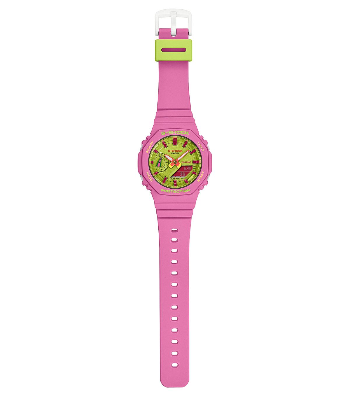 Женские кварцевые аналого-цифровые наручные часы. Серия G-Shock Carbon Core Guard. Противоударный пластиковый корпус с углеродными волокнами (структура Carbon Core Guard) более прочный и в то же время более легкий, защищает механизм часов от ударов и вибраций. Двойная светодиодная подсветка обеспечивает подсветку не только цифрового дисплея, но и аналогового циферблата. Настройка продолжительности подсветки 1,5 или 3 секунды, послесвечение. Зелёный циферблат с часовыми метками в виде штрихов. Светящееся покрытие стрелок обеспечивает длительное послесвечение в темное время суток после короткого воздействия света. 12-ти и 24-х часовой формат отображения времени. Ретроградный стрелочный указатель дня недели находится в позиции 9 ч. Секундомер с точностью показаний 1/100 с (первый час) и 1 с (после первого часа) и временем измерения 24 часа. Режимы измерения: прошедшее время, промежуточное время, два финишных результата. Таймер обратного отсчета от 1 секунды до 24 часов (с интервалом в 1 секунду) с автоповтором. Мировое время - 31 часовой пояс (48 городов), всемирное координированное время (UTC), включение/отключение летнего времени. 5 ежедневных будильников, ежечасный сигнал. Функция перемещения стрелок для удобного просмотра информации на цифровом экране. Функция отключения/включения звука кнопок. Автоматический календарь до 2099 года. Усиленный углеродными волокнами пластиковый восьмиугольный корпус розового цвета. Размеры корпуса 42,9 мм на 46,2мм, толщина 11,2мм. Устойчивое к мелким механическим повреждениям минеральное стекло. Пластиковый розовый ремешок со стандартной застёжкой Buckle. Примерный срок службы батареек 3 года. Водонепроницаемость 200WR (плавание и ныряние без акваланга). Вес около 41 г.