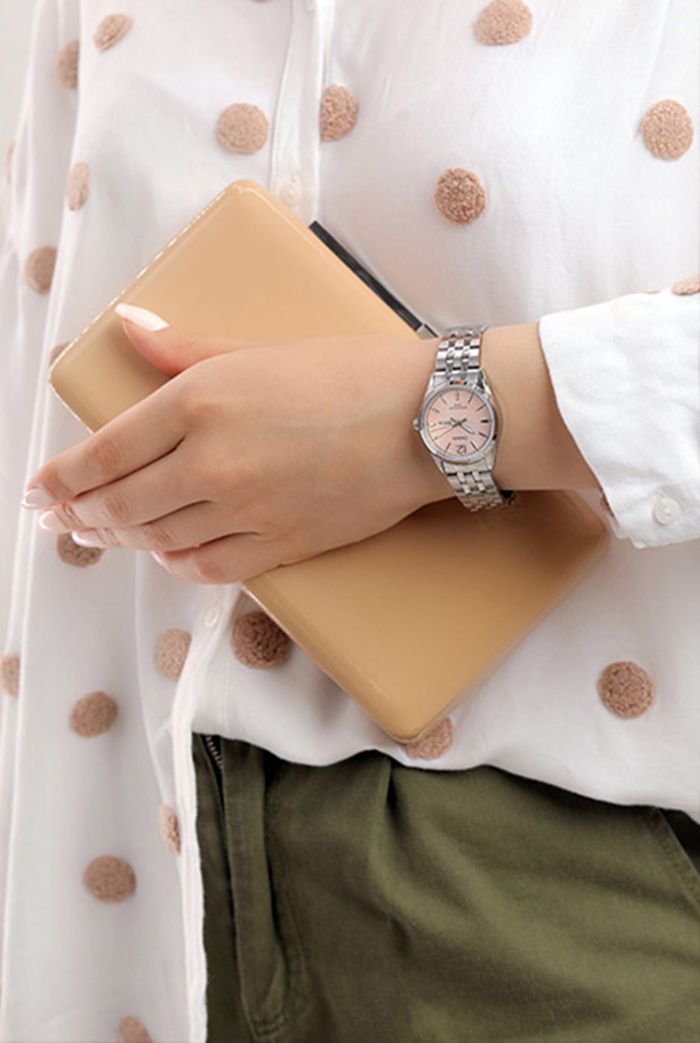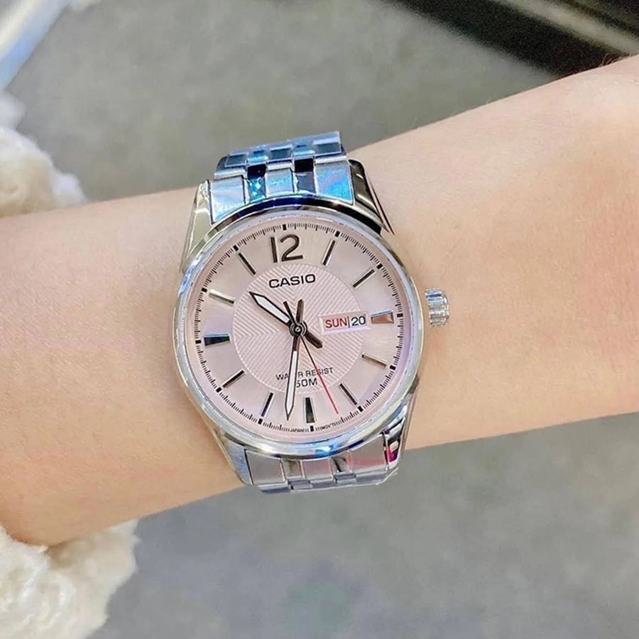 Женские кварцевые наручные часы с аналоговым отображением времени (стрелочные). Серия Casio Collection. Центральные часовая, минутная и секундная стрелки. Розовый циферблат с часовыми метками в виде штрихов и арабской цифры 12. Стрелки с люминесцентным покрытием, которое светится в темноте после непродолжительного воздействия света. Индикация даты и дня недели в положении 3 часов. Устойчивое к мелким механическим повреждениям минеральное стекло. Круглый корпус из гипоаллергенной латуни серебристого цвета. Размер корпуса 30 мм на 36 мм, толщина 8,9 мм. Стальной браслет с тройной раскладывающейся застежкой. Батарейка рассчитана на 3 года. Водонепроницаемость 50WR (допускается мытьё рук, брызги дождя). Вес около 69 г.
