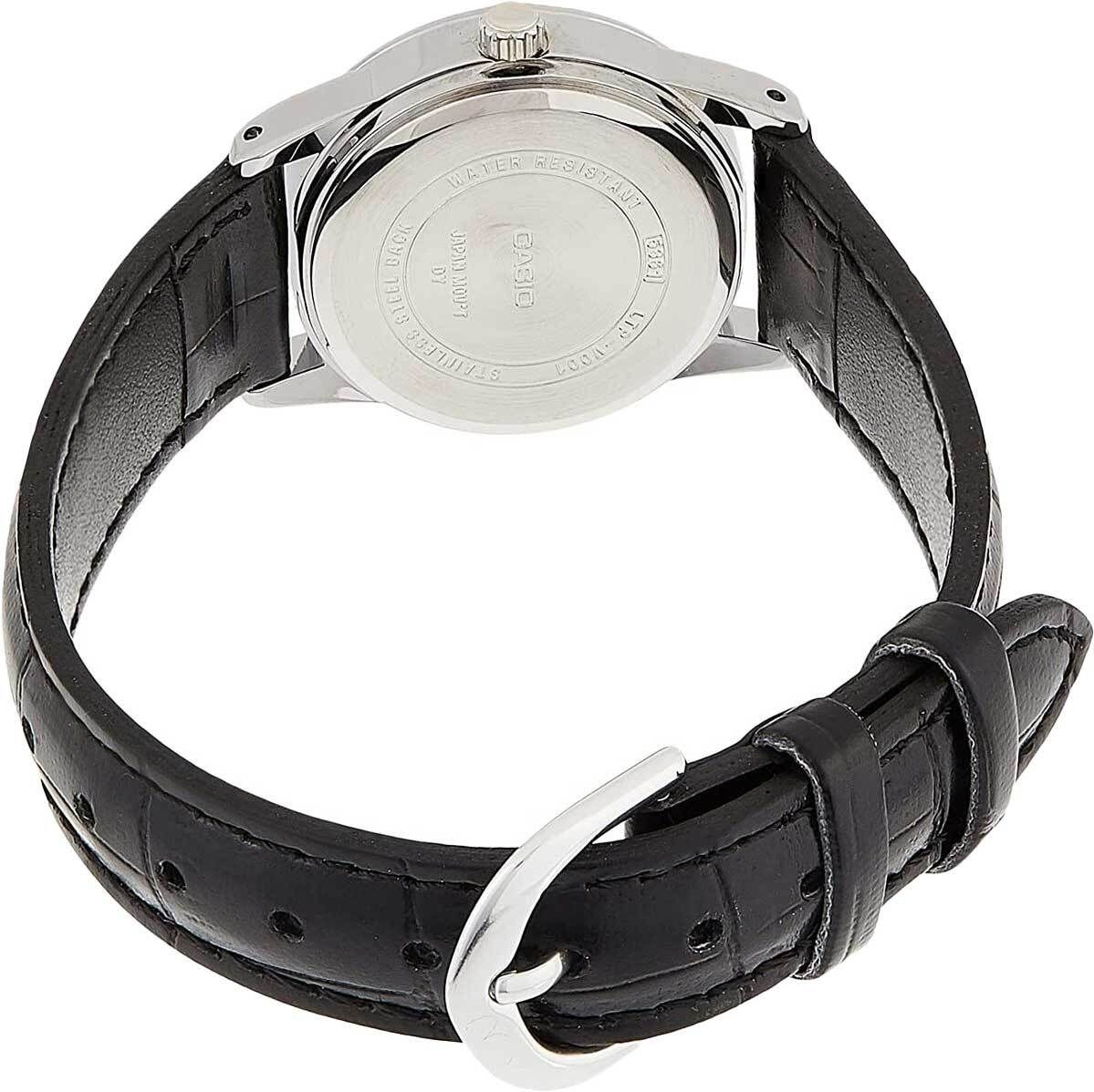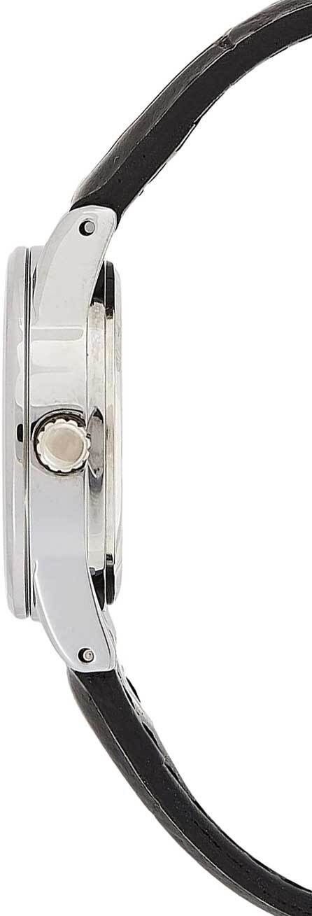Женские кварцевые аналоговые наручные часы. Центральные часовая, минутная и секундная стрелки. Серебристый циферблат с часовыми метками в виде арабских цифр. Устойчивое к мелким механическим повреждениям минеральное стекло. Круглый корпус из стального сплава. Чёрный кожаный ремешок с классической застёжкой. Buckle. Водонепроницаемость 30WR (брызги). Вес около 21 г.