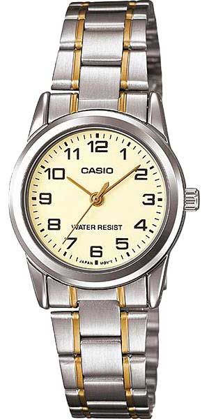 Женские кварцевые аналоговые наручные часы. Центральные часовая, минутная и секундная стрелки. Бежевый циферблат с часовыми метками в виде арабских цифр. Устойчивое к мелким механическим повреждениям минеральное стекло. Браслет из нержавеющей стали с частичным покрытием цвета розового золота, раскладывающаяся застёжка. Водонепроницаемость 30WR (брызги). Вес около 54 г.