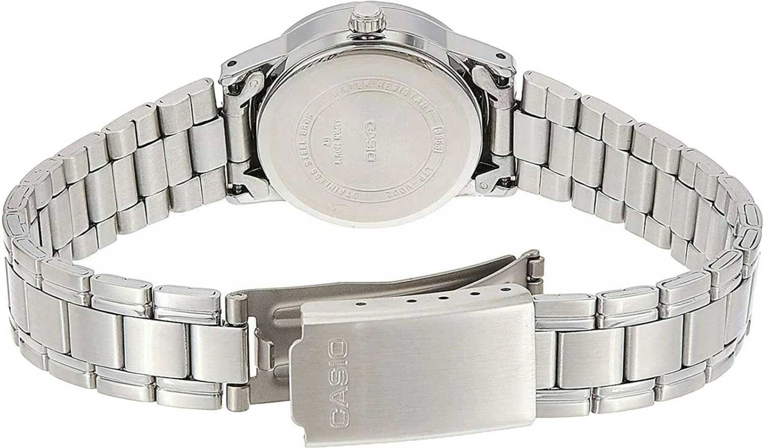 Женские кварцевые аналоговые часы. Серия Casio Collection. Центральные часовая, минутная и секундная стрелки. Чёрный циферблат с часовыми метками в виде штрихов и двух римских цифр XII и VI. Окошко даты в позиции 3 ч. Устойчивое к мелким механическим повреждениям минеральное стекло. Круглый корпус из гипоаллергенной латуни серебристого цвета. Размер корпуса 31 мм на 25 мм, толщина 9,2 мм. Рифлёная переводная головка. Стальной браслет с тройной раскладывающейся застежкой. Батарейка рассчитана на 3 года. Водонепроницаемость 30WR (защита от брызг). Вес около 53 г.