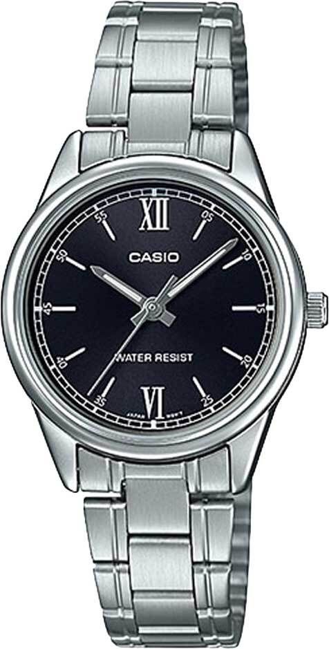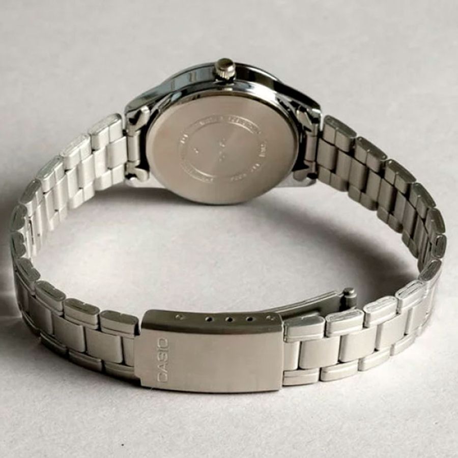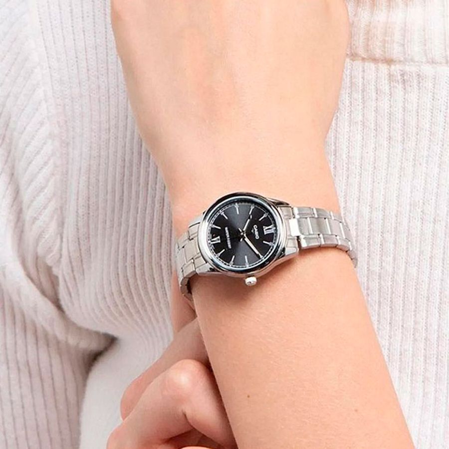 Женские кварцевые часы с аналоговым отображение времени. Серия Casio Collection. Центральные часовая, минутная и секундная стрелки. Чёрный циферблат с часовыми метками в виде штрихов и двух римских цифр XII и VI. Стрелки с люминесцентным покрытием, которое светится в темноте после непродолжительного воздействия света. Минутная шкала на циферблате. Устойчивое к мелким механическим повреждениям минеральное стекло. Круглый корпус из гипоаллергенной латуни серебристого цвета. Размер корпуса 34 мм на 28,2 мм, толщина 7,5 мм. Рифлёная переводная головка. Стальной браслет с тройной раскладывающейся застежкой. Батарейка рассчитана на 3 года. Водонепроницаемость 30WR (защита от брызг). Вес около 52 г.