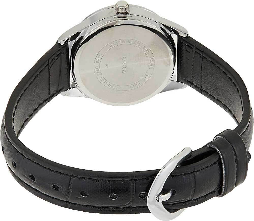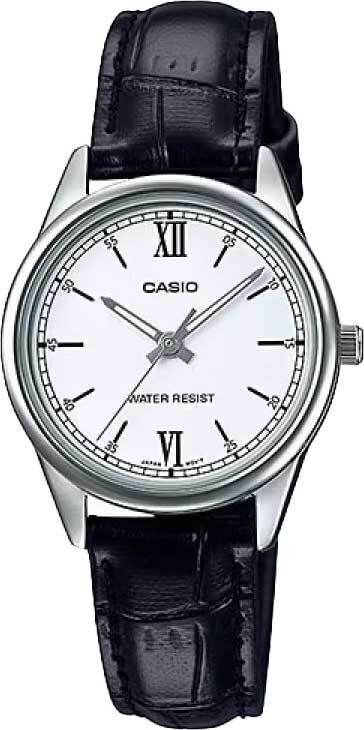 Женские кварцевые аналоговые наручные часы. Casio Collection. Центральные часовая, минутная и секундная стрелки. Белый циферблат с часовыми метками в виде штрихов и двух римских цифр 6 и 12. Стрелки и метки с люминесцентным покрытием, которое светится в темноте после непродолжительного воздействия света. Устойчивое к мелким механическим повреждениям минеральное стекло. Круглый корпус размером 34 мм на 28,2мм, толщиной 7,5 мм. Чёрный кожаный ремешок с классической застёжкой buckle. Батарейка рассчитана на 3 года. Водонепроницаемость 30WR (брызги). Вес около 24 г.
