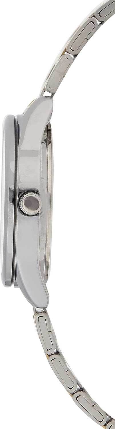 Женские аналоговые кварцевые часы. Коллекция Standard.. Центральные часовая, минутная и секундная стрелки. Белый циферблат с часовыми метками в виде штрихов. Круглый стальной корпус. Размер корпуса 34 мм на 28,2 мм, толщина 7.5 мм. Рифлёная переводная головка. Устойчивое к мелким механическим повреждениям минеральное стекло. Стальной браслет с частичным покрытием цвета розового золота, раскладывающаяся застежка. Водостойкость WR 30 (брызги). Вес примерно 52 г.