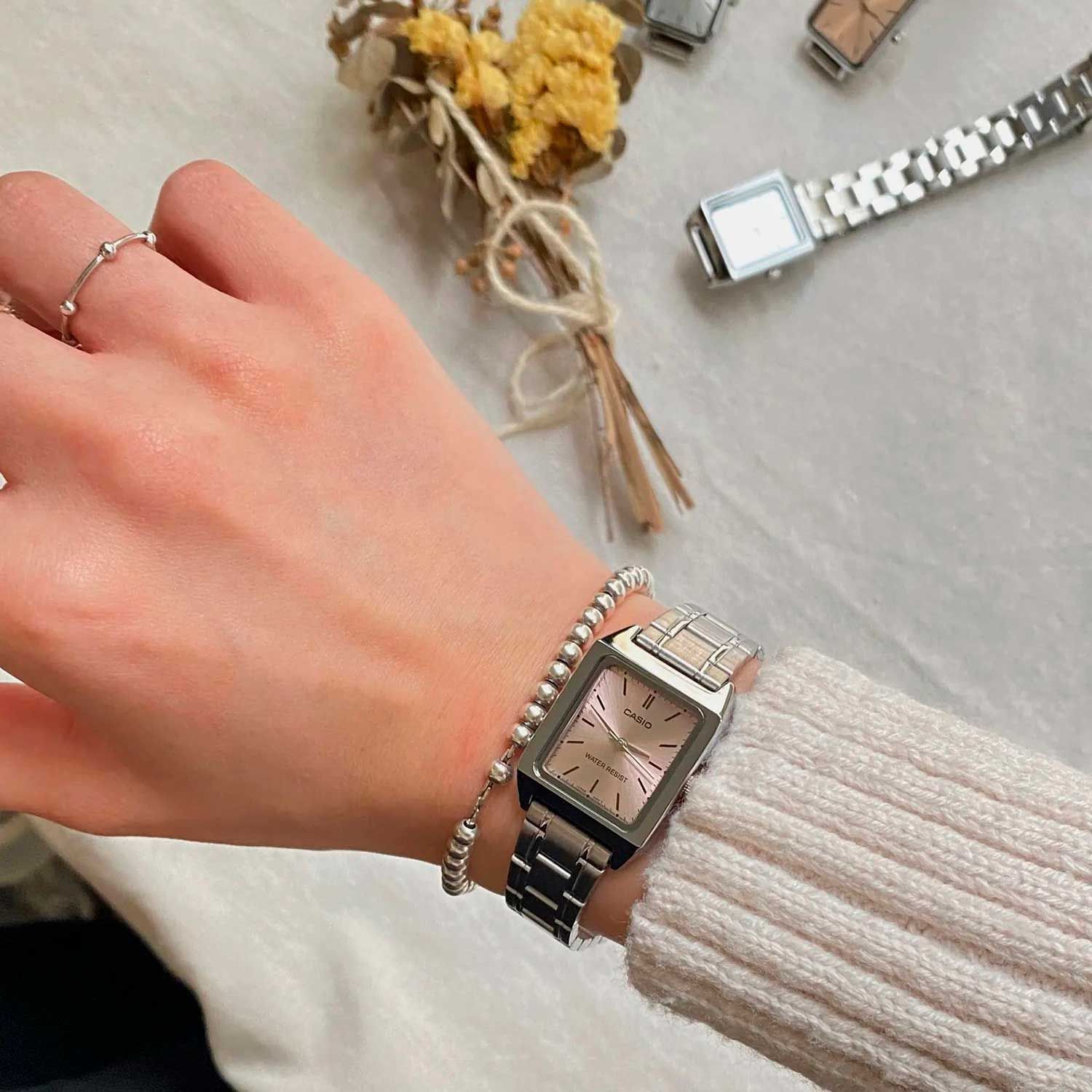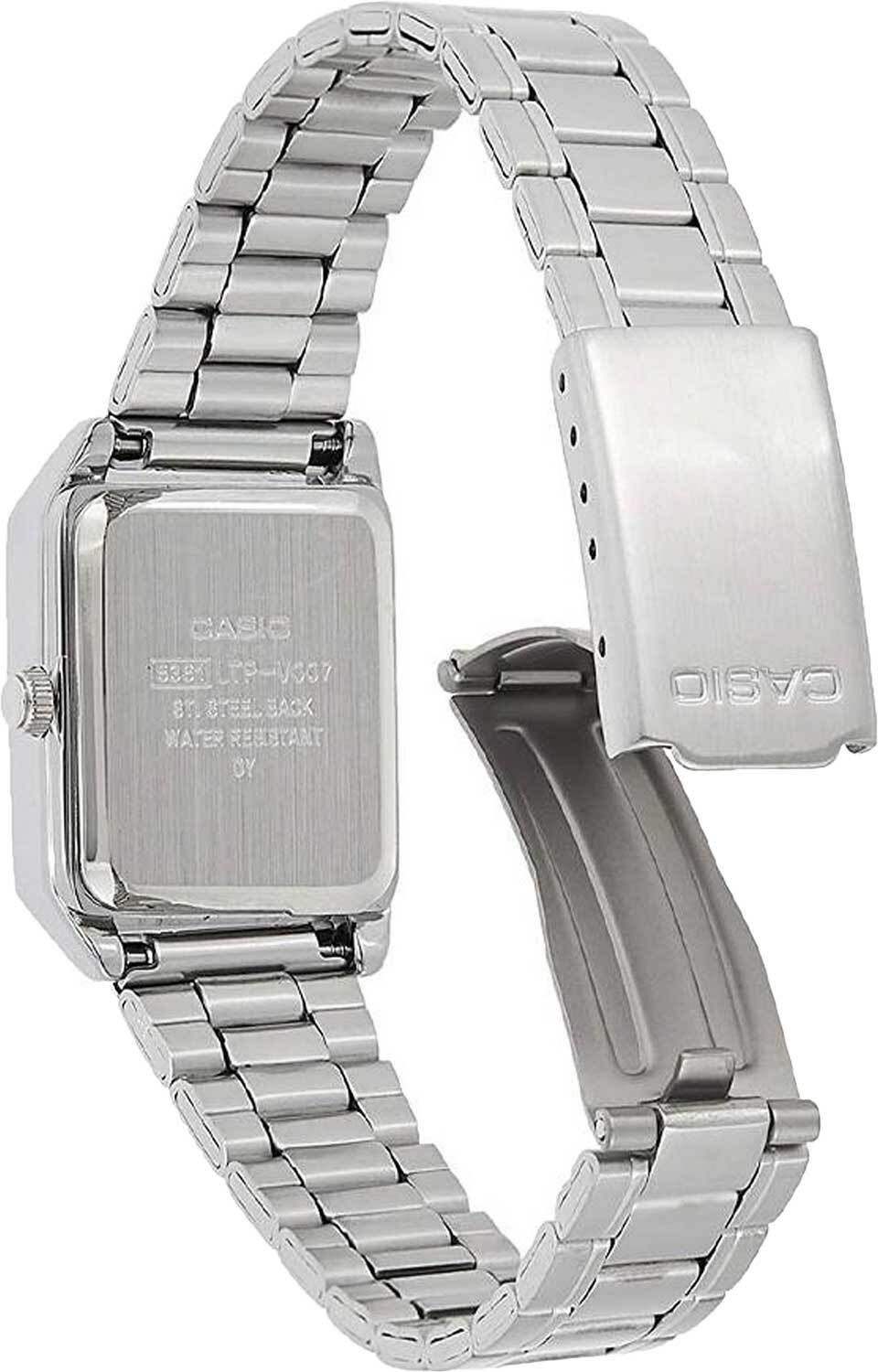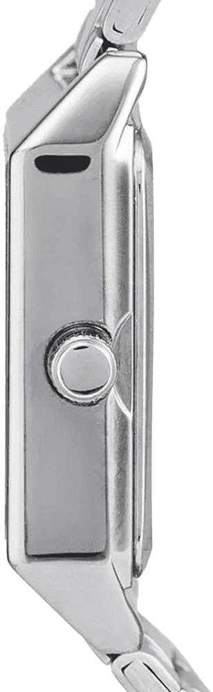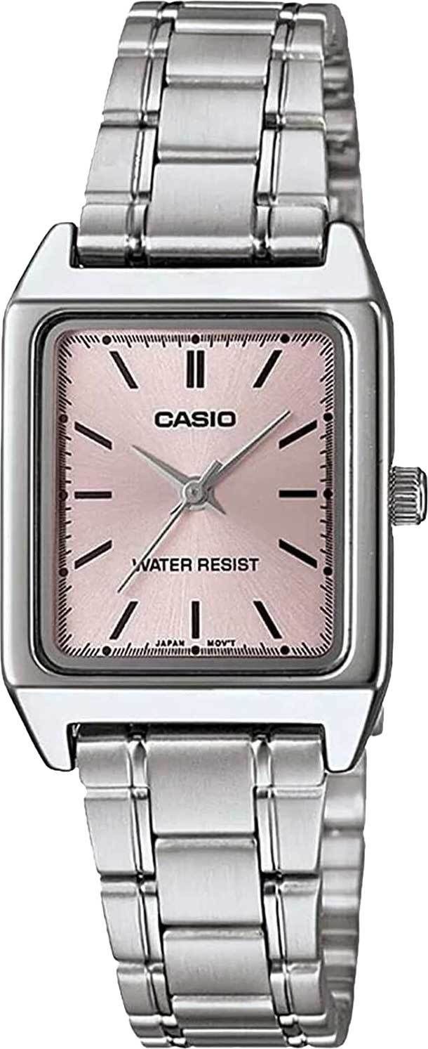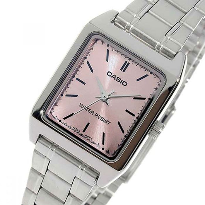 Женские кварцевые аналоговые наручные часы. Центральные часовая, минутная и секундная стрелки серебристого цвета. Розовый циферблат с часовыми метками в виде штрихов выполнен по технологии Sunray (солнечные лучи). Прямоугольный корпус размером 22 мм на 31мм, толщиной 7,5 мм. Устойчивое к мелким механическим повреждениям минеральное стекло. Стальная задняя крышка. Рифлёная переводная головка. Стальной браслет с тройной раскладывающейся застёжкой. Батарейка рассчитана на 3 года. Водозащищенность 30WR (защита от брызг). Вес около 51 г.