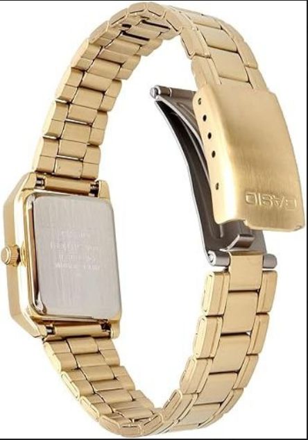 Женские кварцевые аналоговые наручные часы. Casio Collection. Центральные часовая, минутная и секундная стрелки золотистого цвета. Золотистый циферблат с часовыми метками в виде римских цифр выполнен по технологии Sunray (солнечные лучи). Прямоугольный корпус золотистого цвета размером 22 мм на 31мм, толщиной 7,5 мм. Устойчивое к мелким механическим повреждениям минеральное стекло. Стальная задняя крышка. Рифлёная переводная головка. Стальной браслет с покрытием цвета жёлтого золота, тройная раскладывающаяся застёжка. Батарейка рассчитана на 3 года. Водозащищенность 30WR (защита от брызг). Вес около 51 г.