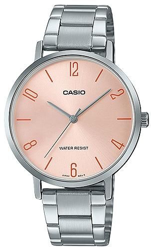 Женские кварцевые часы с аналоговым отображение времени. Серия Casio Collection. Центральные часовая, минутная и секундная стрелки. Розовый циферблат с часовыми метками в виде штрихов и шести арабских цифр (12, 2, 4, 6, 8 и 10). Устойчивое к мелким механическим повреждениям минеральное стекло. Круглый корпус из гипоаллергенной латуни серебристого цвета. Размер корпуса 34 мм на 40 мм, толщина 7,9 мм. Рифлёная переводная головка. Стальной браслет с тройной раскладывающейся застежкой. Батарейка рассчитана на 3 года. Водонепроницаемость 30WR (защита от брызг). Вес около 62 г.