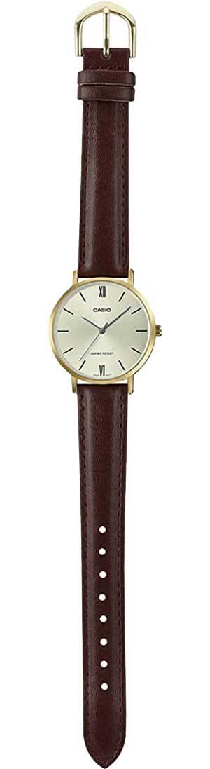 Женские кварцевые аналоговые наручные часы. Центральные часовая, минутная и секундная стрелки. Золотистый циферблат. Круглый корпус из нержавеющей стали с IP-покрытием цвета жёлтого золота. Минеральное стекло устойчивое к мелким механическим повреждениям. Коричневый кожаный ремешок со стандартной застёжкой. Водостойкость 30 WR (брызги).