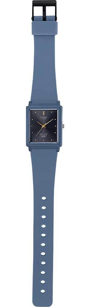 Женские кварцевые часы с аналоговым отображением времени. Серия Casio Collection. Центральные часовая, минутная и секундная стрелки. Чёрный циферблат с часовыми метками в виде точек. Пластиковое стекло. Прямоугольный пластиковый корпус синего цвета. Размеры корпуса 37.2 мм на 26.5 мм, толщина 8,1 мм. Рифлёная переводная головка. Синий пластиковый ремешок с классической застёжкой buckle. Батарейка рассчитана на 3 года. Водонепроницаемость 30WR (защита от брызг). Вес около 19 г.