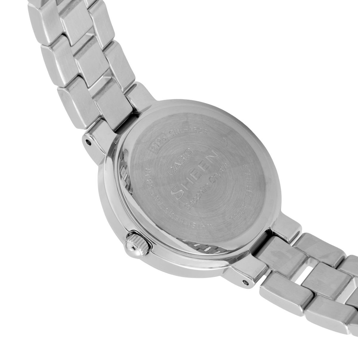 Женские кварцевые часы с аналоговым отображением времени. Серия Sheen Guardian Star. Центральные часовая, минутная и секундная стрелки. Белый циферблат с часовыми метками в виде штрихов и двух римских цифр XII и VI. Окошко даты в положении 3 часов. Минутная шкала на циферблате. Циферблат украшен кристаллом в положении 9 часов. Устойчивое к возникновению мелких царапин сапфировое стекло. Круглый корпус из нержавеющей стали. Размеры корпуса 32 мм на 26,5 мм, толщина 7,3 мм. Стальной браслет с тройной раскладывающейся застежкой. Батарейка рассчитана на 3 года. Водонепроницаемость 50WR (мытьё рук, дождь). Вес около 59 г.