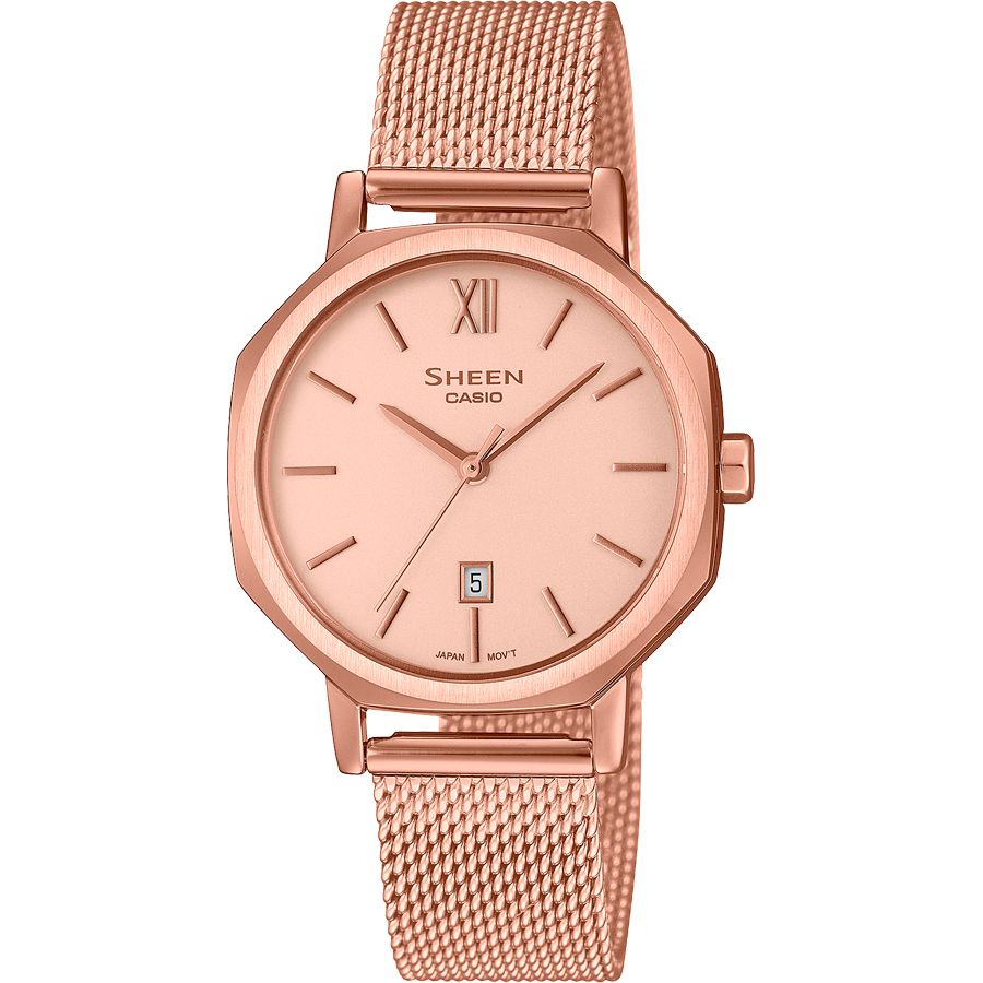 Женские кварцевые аналоговые наручные часы. Коллекция Sheen. Центральные часовая, минутная и секундная стрелки. Индикация даты в положении 6 ч. Розовый циферблат с часовыми метками в виде штрихов. Устойчивое к мелким механическим повреждениям сапфировое стекло. Стальной корпус с с PVD покрытием цвета розового золота. Стальной браслет миланского плетения с PVD покрытием цвета розового золота. Водонепроницаемость WR50 (плавание без погружения).