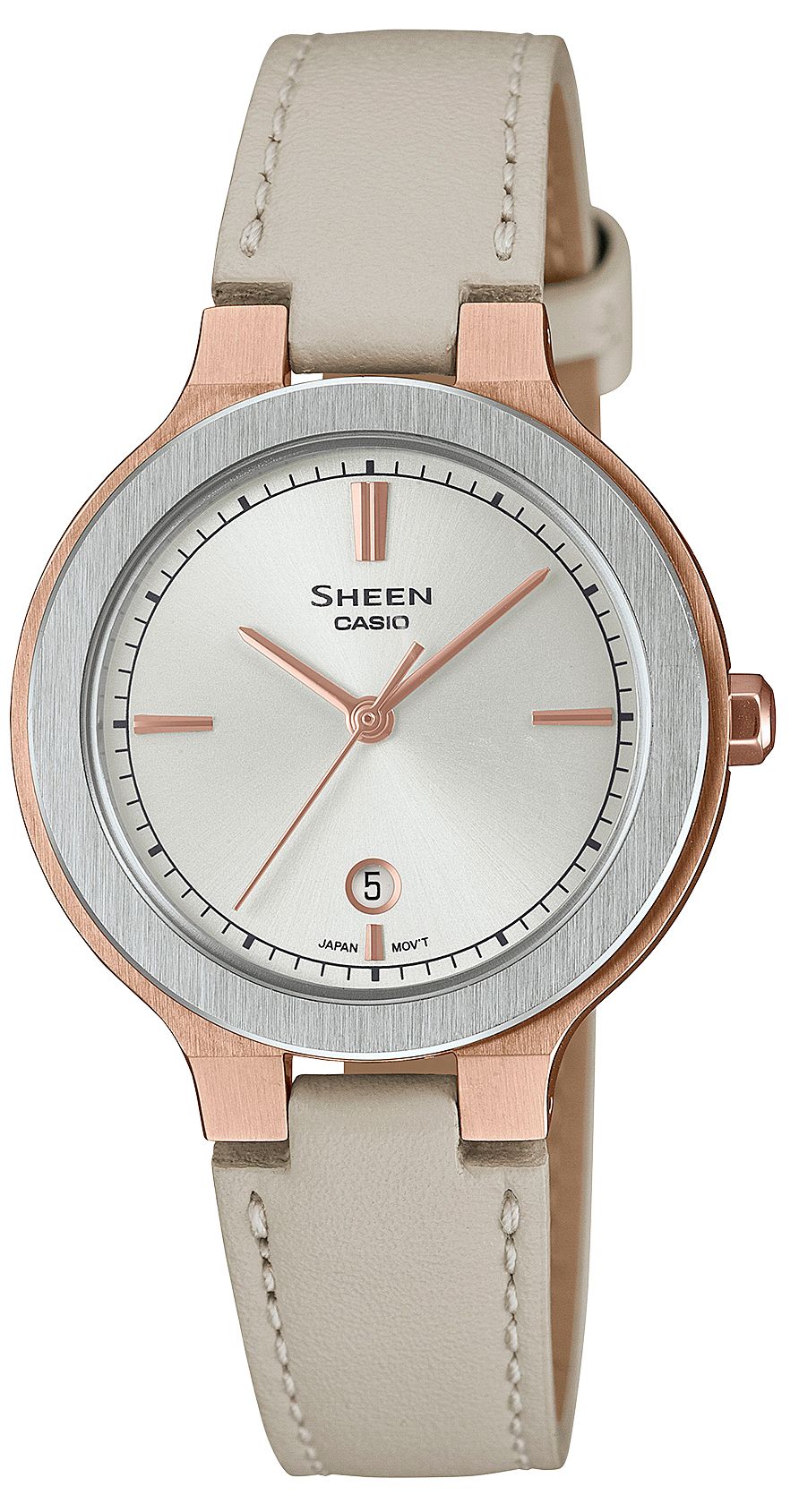 Женские кварцевые аналоговые наручные часы. Центральные часовая, минутная и секундная стрелки. Апертура даты в позиции 6 часов. Серебристый циферблат. Круглый корпус выполнен из нержавеющей стали с IP покрытием цвета розового золота. Размер корпуса составляет 35 х 30 х 6,2 мм. Бежевый ремешок, стандартная застежка. Устойчивое к возникновению царапин сапфировое стекло. Водостойкость WR 50 (мытье рук, дождь). Вес примерно 25 г.